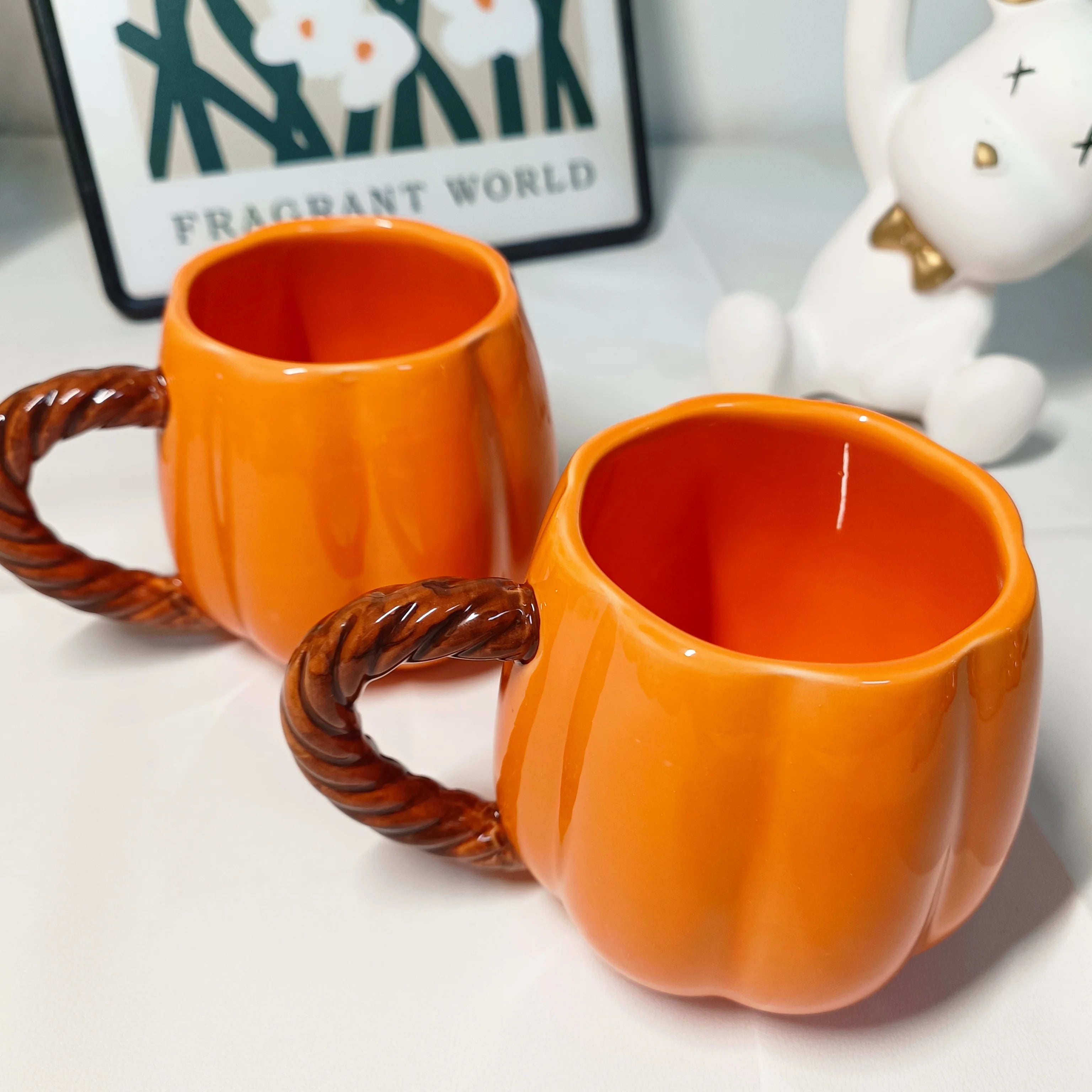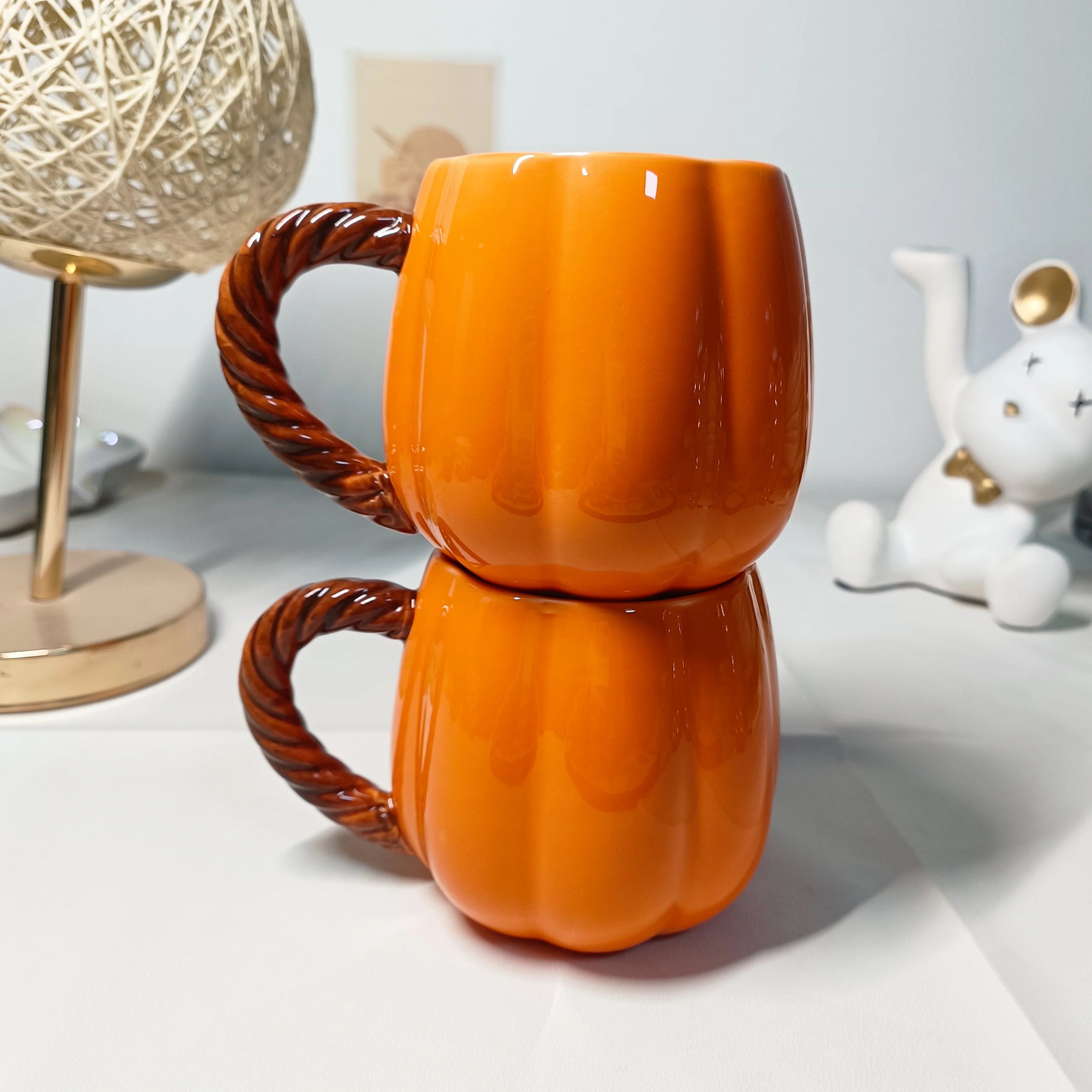 A sculpted pumpkin cup with a hand‑twisted “vine” handle, glazed to a deep orchard shine and sized for generous morning pours. Fired from premium ceramic, it’s sturdy enough for daily coffee yet charming for holiday tables.