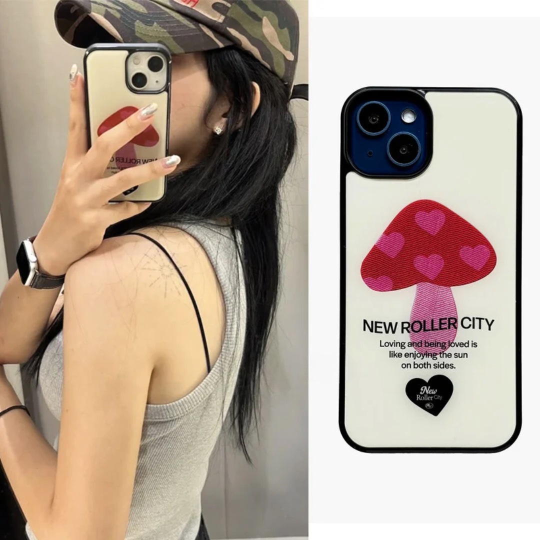 Retro‑cute, K‑style energy. A cream back printed with a red love mushroom and a slim black bumper that keeps it pocket‑ready.