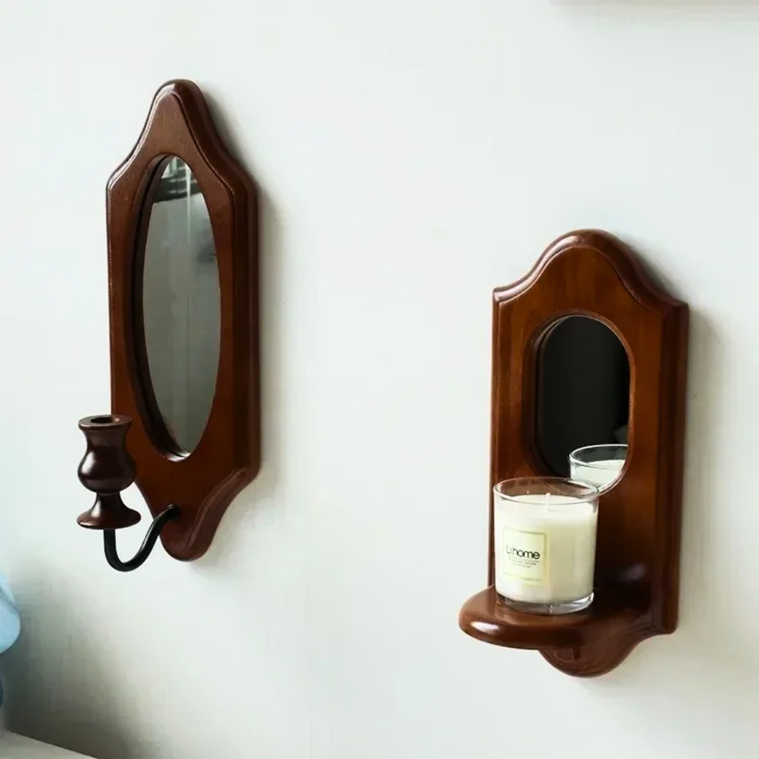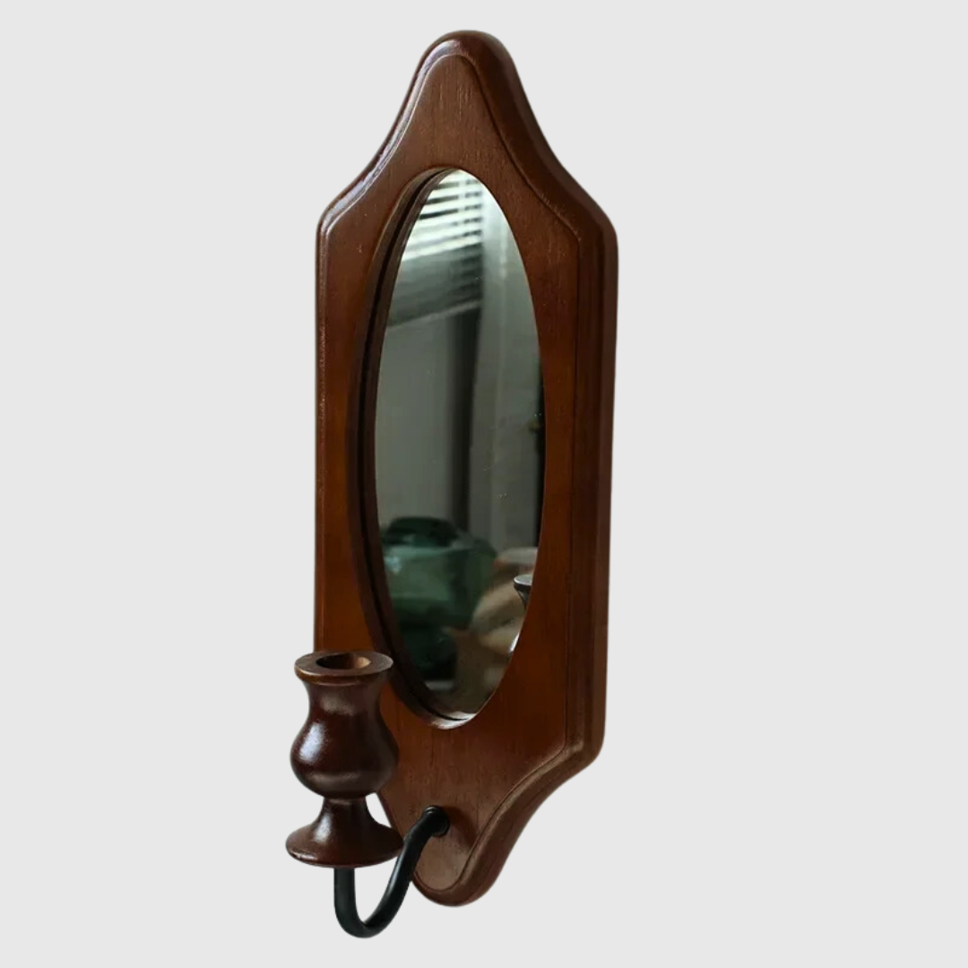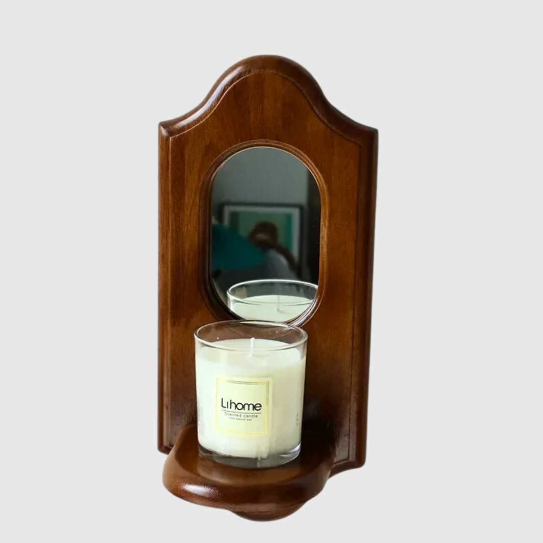 Bask in the warm ambiance created by the mirror adorned with a built-in candle holder. The rich wood finish, imbued with deep, inviting tones, acts as a canvas for the intricate carvings.