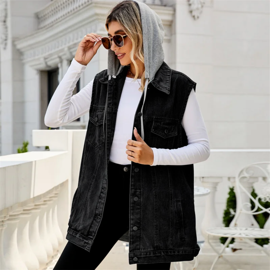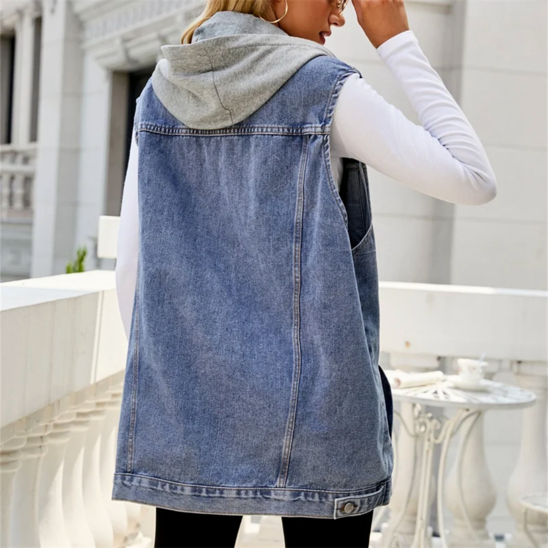 The cozy hood adds warmth and style, making it perfect for those cooler days or evenings. With its relaxed fit and longer length, it's ideal for layering over any outfit, from dresses to jeans. The soft, premium denim creates an effortlessly cool and comfortable look.