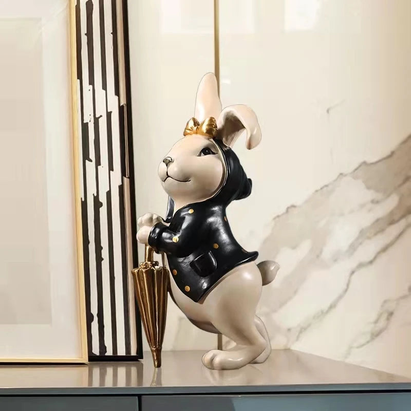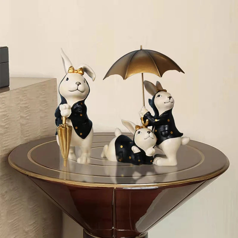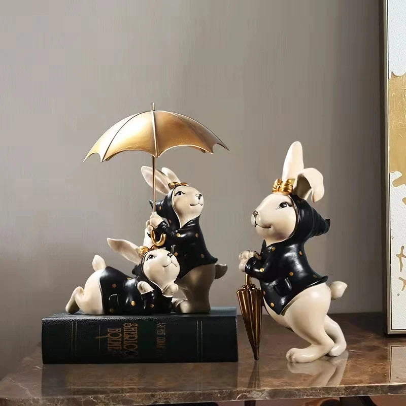 These dapper dudes ain't afraid of a sprinkle! The Hoppy Helpers Rabbit Trio keeps your style sheltered with their fancy suits and a golden umbrella.