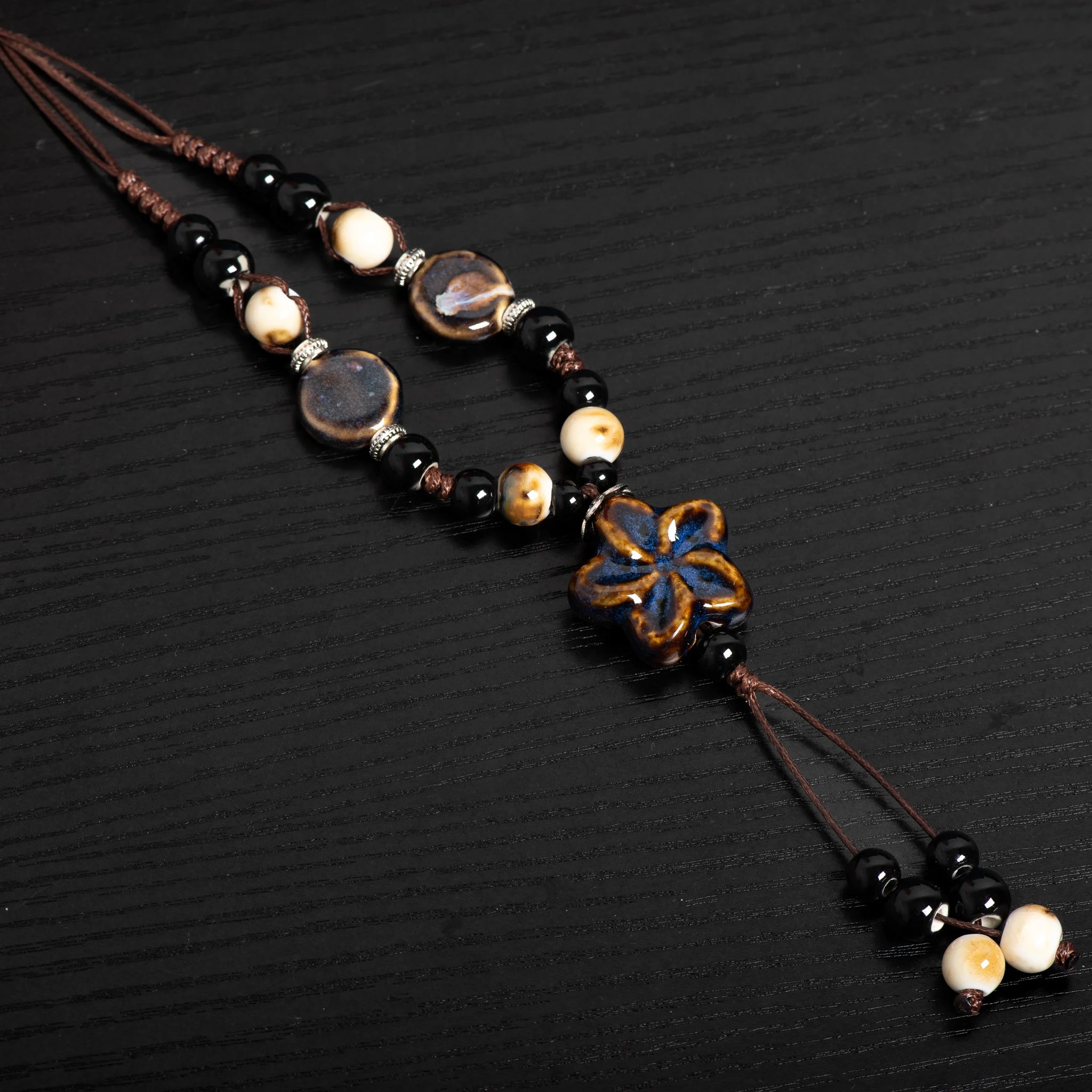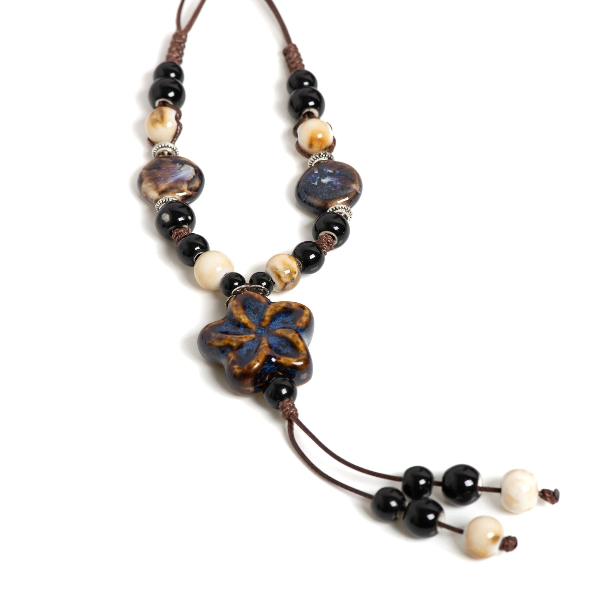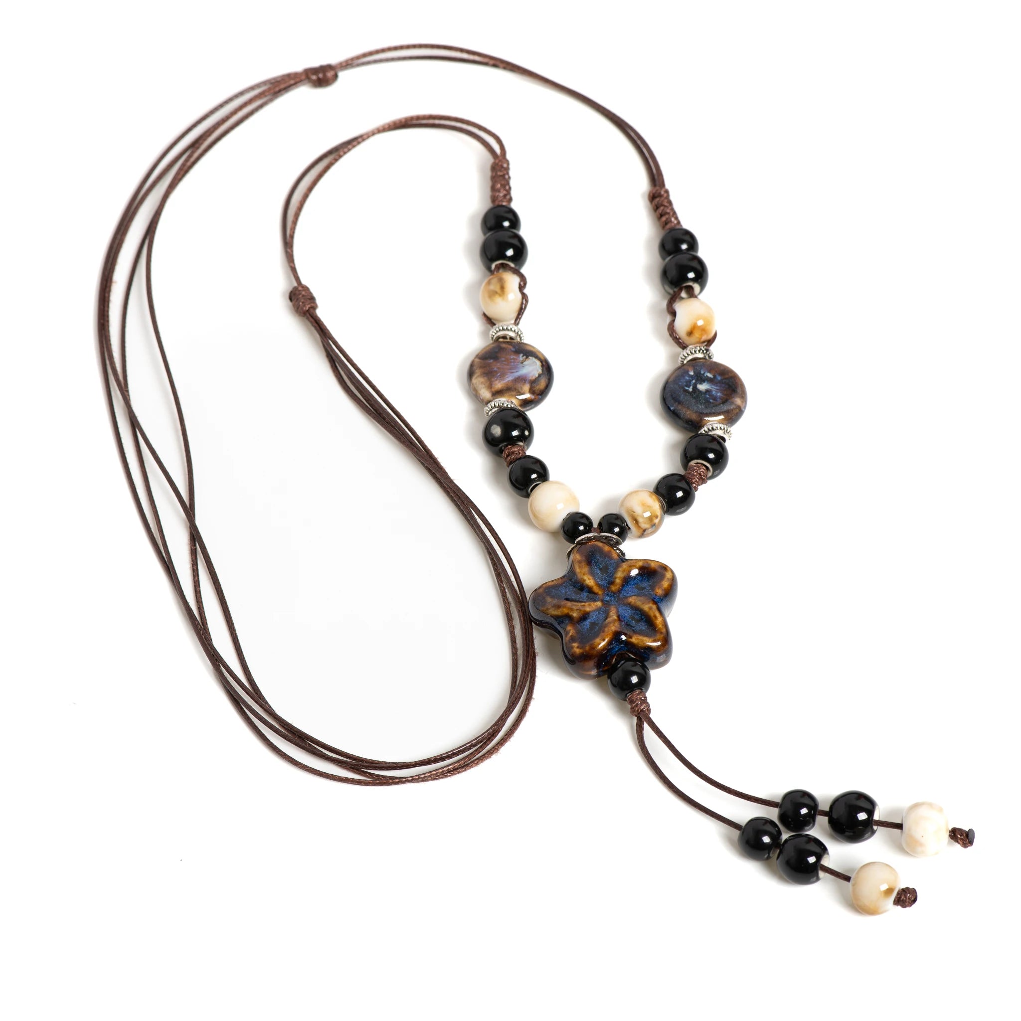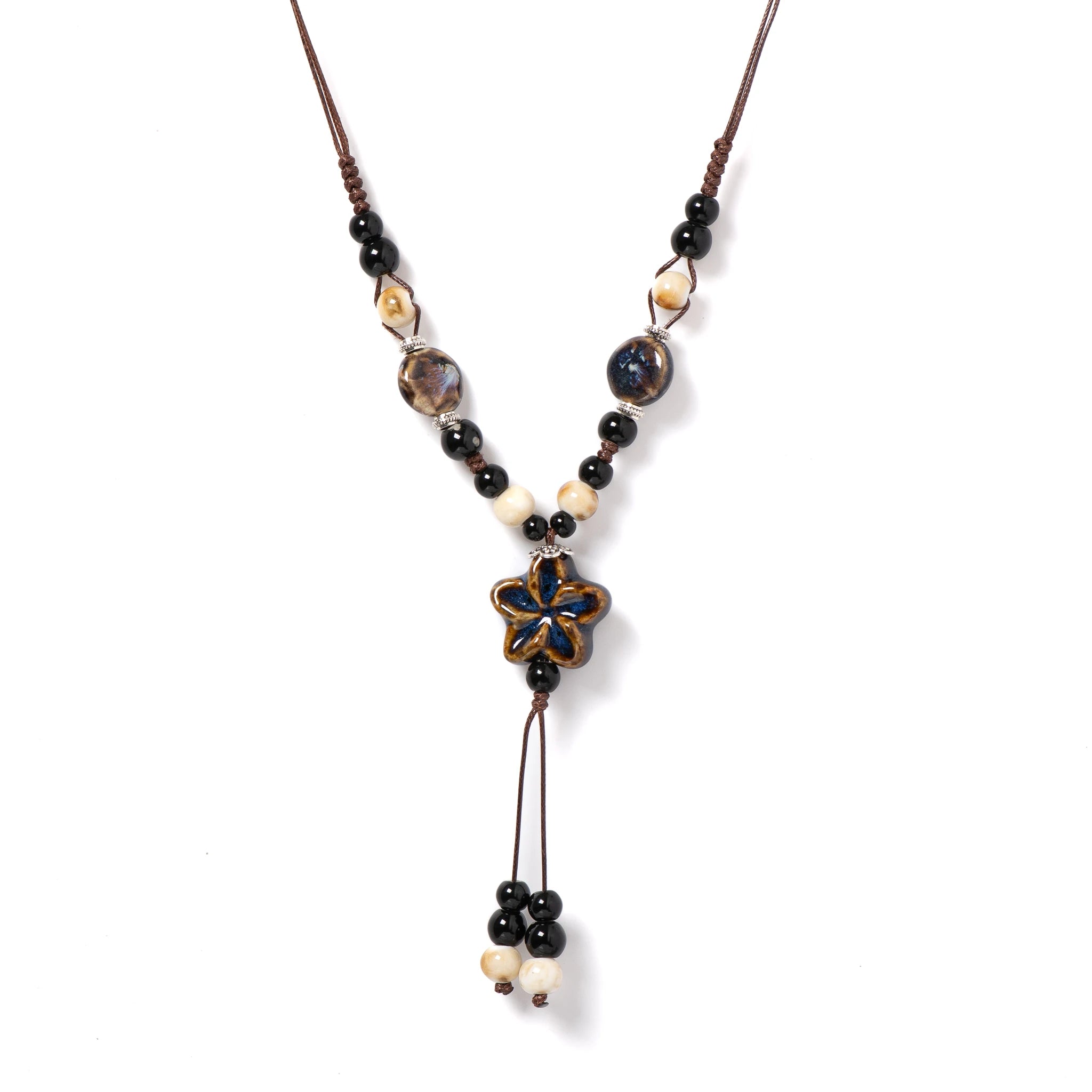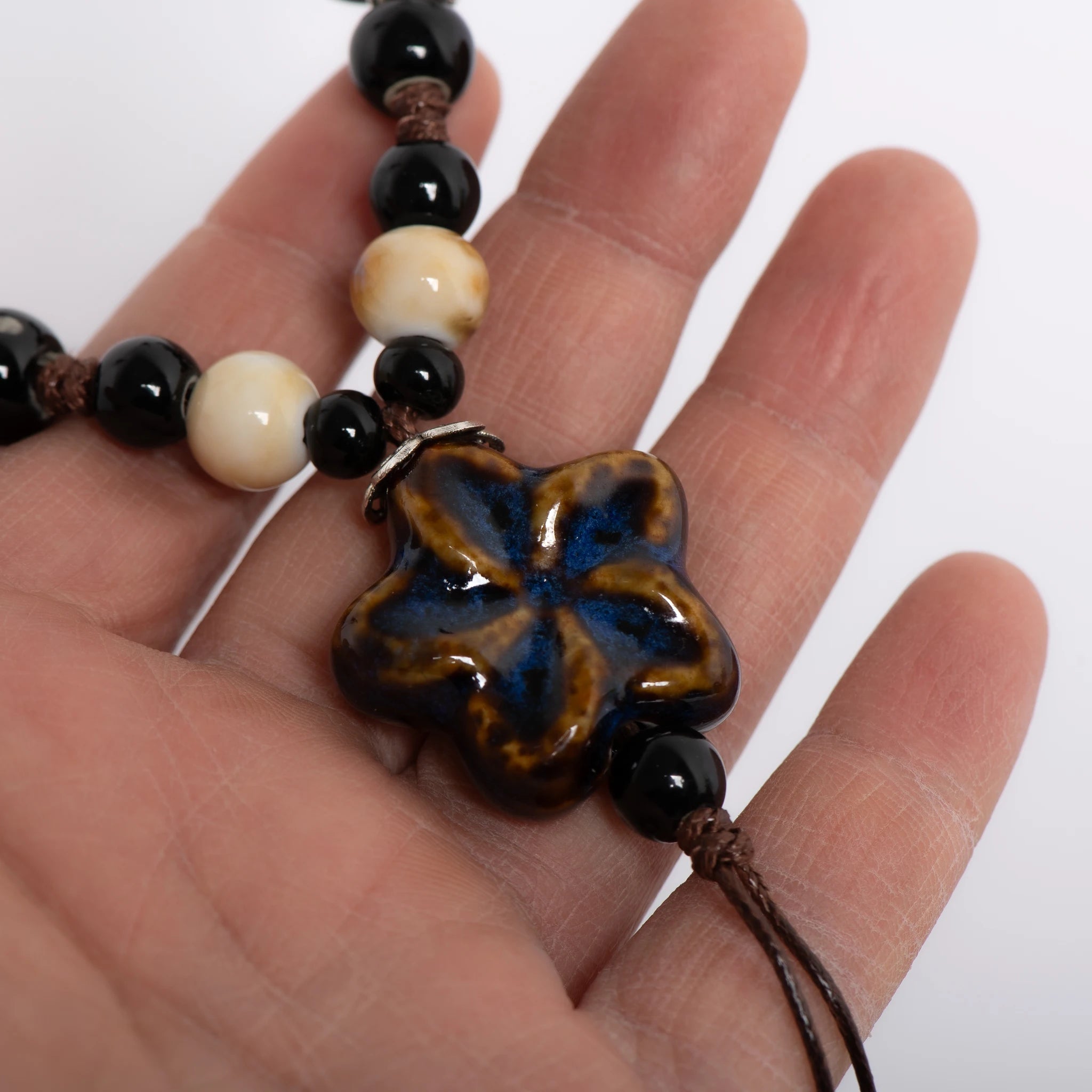 Elevate your boho vibe with a hand‑glazed ceramic star that glows in rich, dreamy blues. Its adjustable cord lets you rock this piece at any length, while earthy beads add that perfect laid‑back charm.