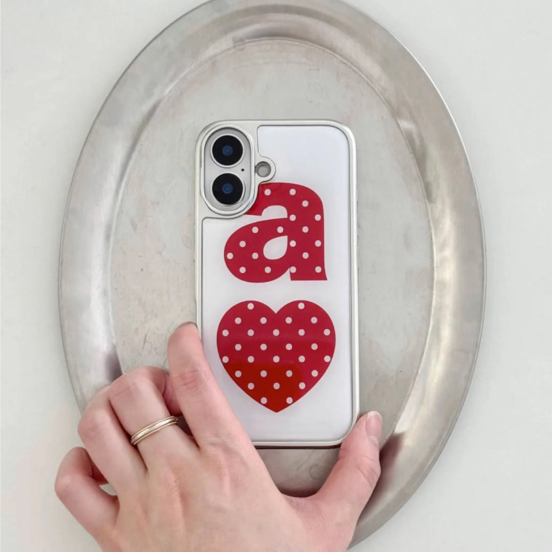 A pop‑sweet bubble “a” and dotted heart glow in cherry red against an iced‑white backdrop, sealed under a porcelain‑gloss coat that feels couture not plastic. The silhouette stays wafer‑slim thanks to a feather‑light shock bumper, and each case is discreetly numbered at the base—turning your iPhone into a collectible postcard from Seoul.