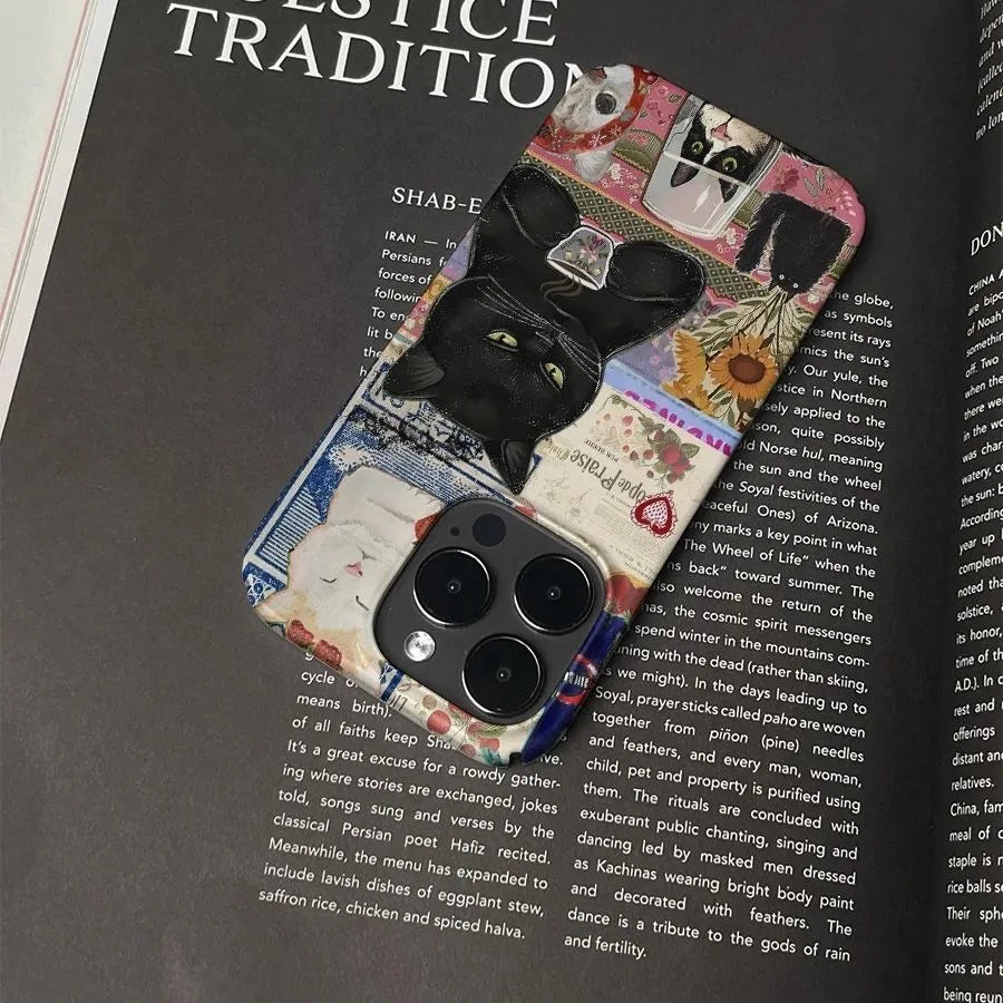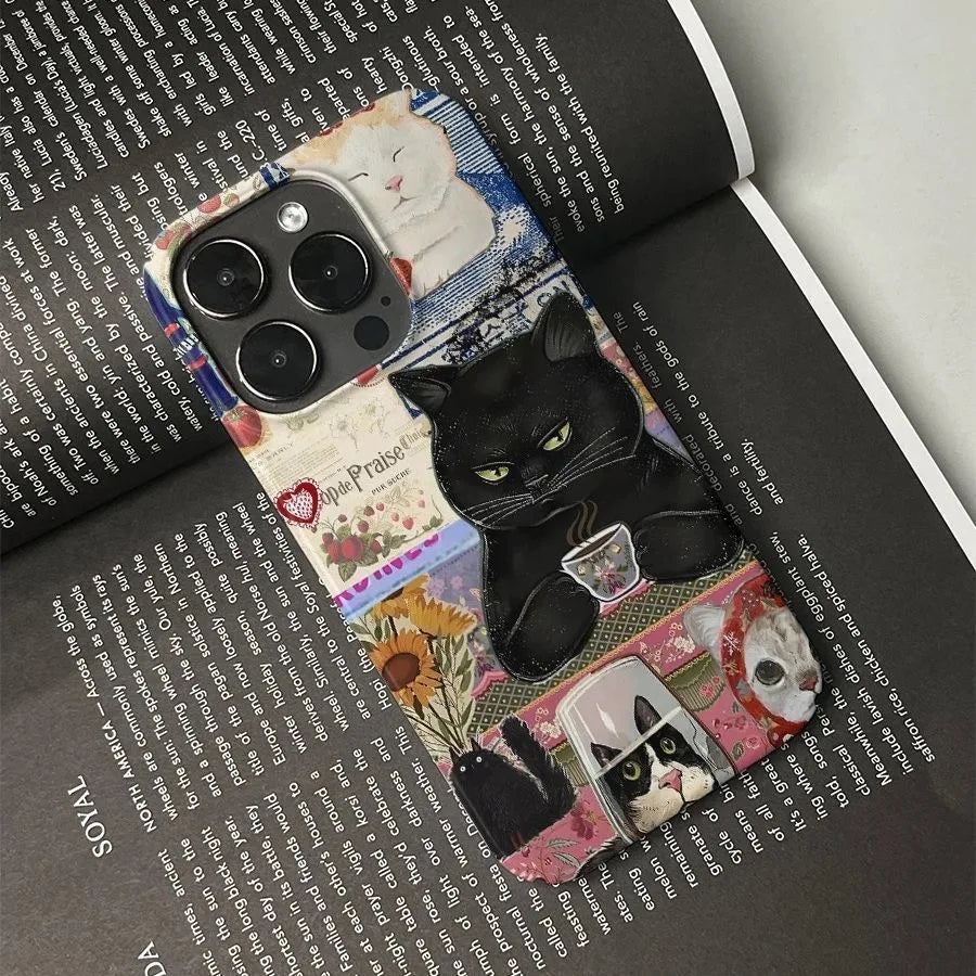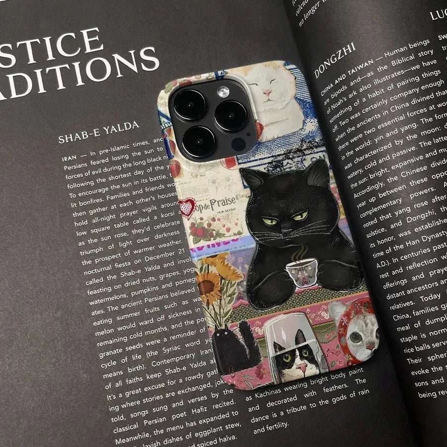 INK CAFE turns a clear cover into a storybook vignette. A coffee‑sipping black cat is set against a patchwork collage, printed on a slim, flexible shell that wraps edge to edge while keeping pockets sleek. Raised bezels add everyday protection without bulk.