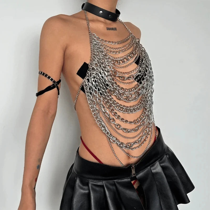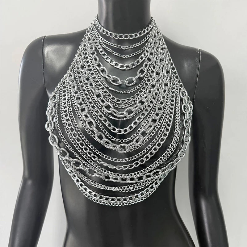 Iron Muse cascades polished curb chains in tiered drapes that contour the torso like liquid armor, perfect over bikinis, bodysuits, or bare skin. Despite its bold metallic presence, the aluminum links stay surprisingly light and adjust at the neck and back for a comfortable, secure festival fit.