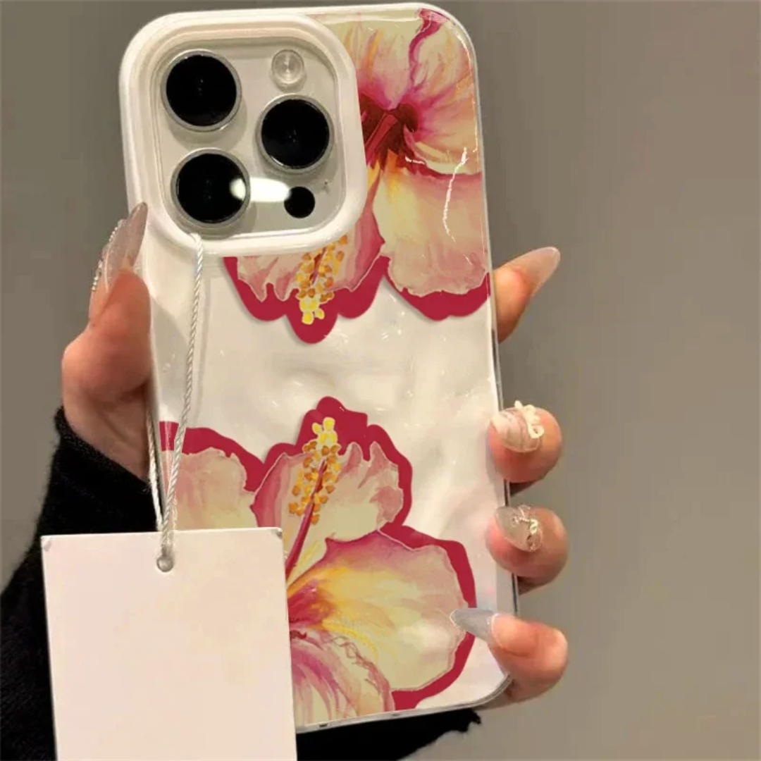 Oversized hibiscus blooms sweep across a soft, light‑catching folds finish, wrapping the edges like a painted silk scarf. The profile stays slim and couture just enough grip, crisp clicky buttons, and a clean frame that lets the artwork glow.