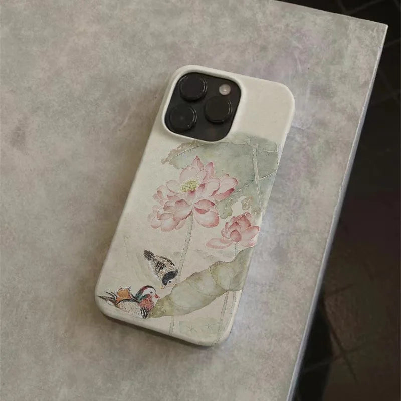 A gallery‑caliber print meets a modern silhouette. Mandarin Lotus layers soft ivory parchment with watercolor lotus blooms and a serene pair of mandarin ducks—symbols of harmony—rendered in classic brushwork. The satin‑matte shell feels silky, hugs the phone with a slim profile, and frames the camera with a protective lip while letting your device charge wirelessly.