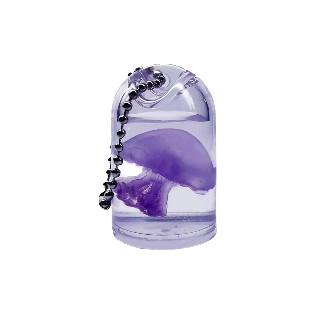 A crystal‑clear resin capsule suspends a sculpted jellyfish in lifelike drift, refracting light with every tilt of your phone or keys. The polished ball chain and tiny pearl‑star accents add a touch of ocean magic to bags, zips, or cases.