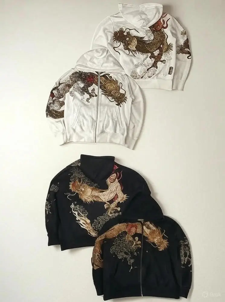 A coiled dragon crashes through sakura blooms, wrapping the chest, back, and sleeves in sculpture‑like embroidery that catches every light. Thick fleece and a smooth front zipper give it a plush, oversized drape—the kind that photographs beautifully and feels even better.