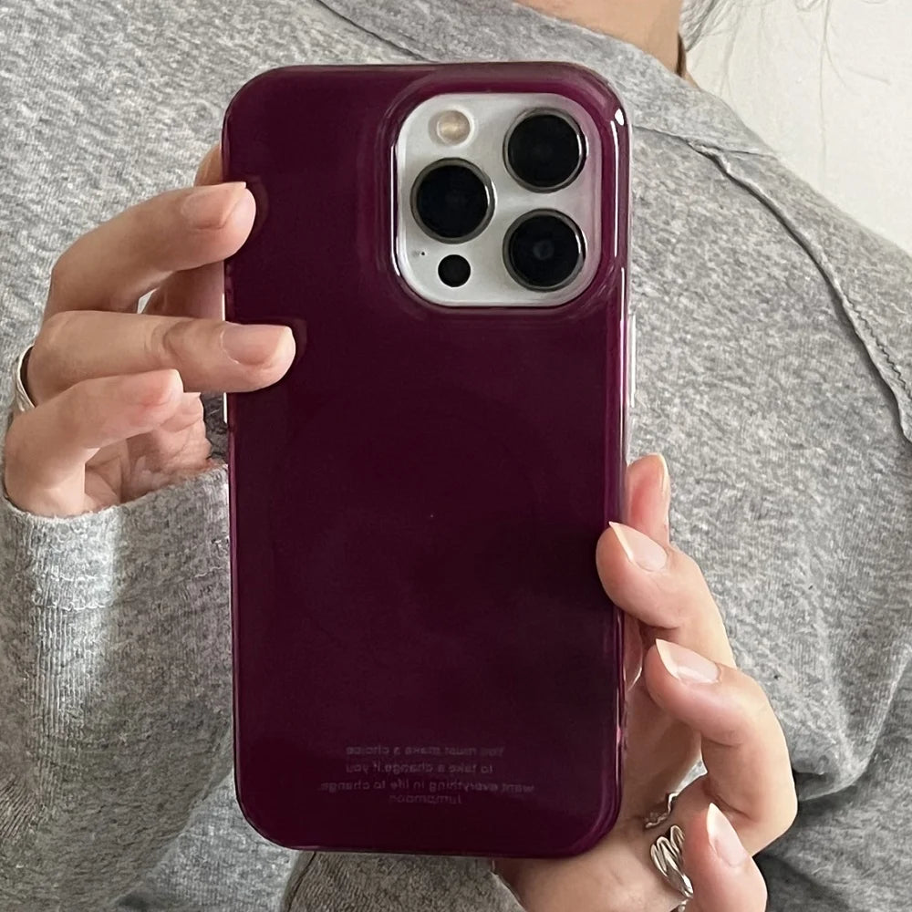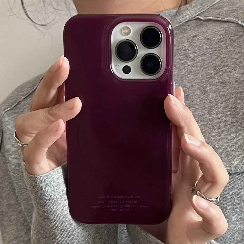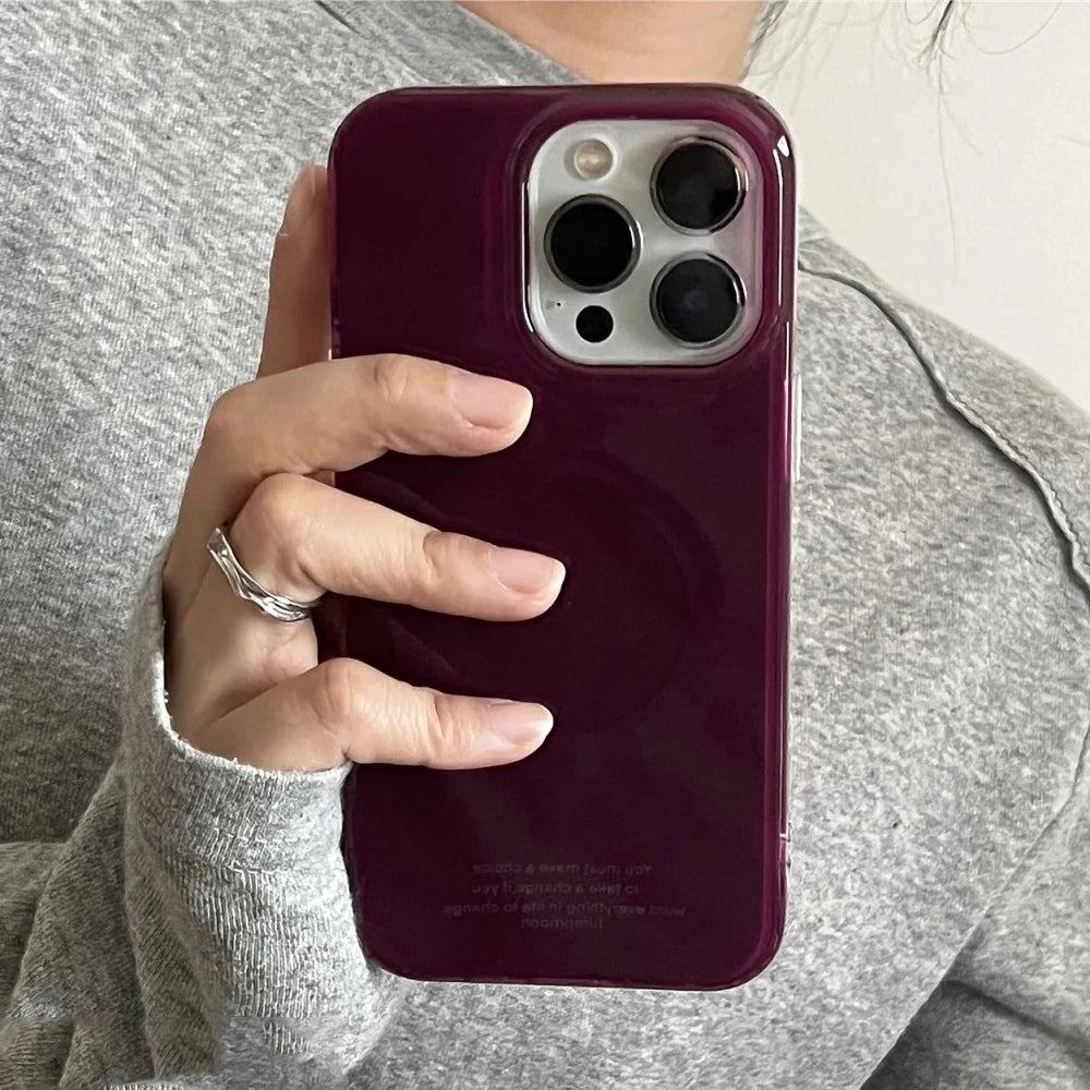 A deep, wine‑toned shell finished in mirror‑smooth lacquer that turns your phone into a pocketable statement piece. Precision‑molded with an integrated magnetic ring, it locks onto MagSafe chargers and accessories while a slim lip guards the camera and edges.