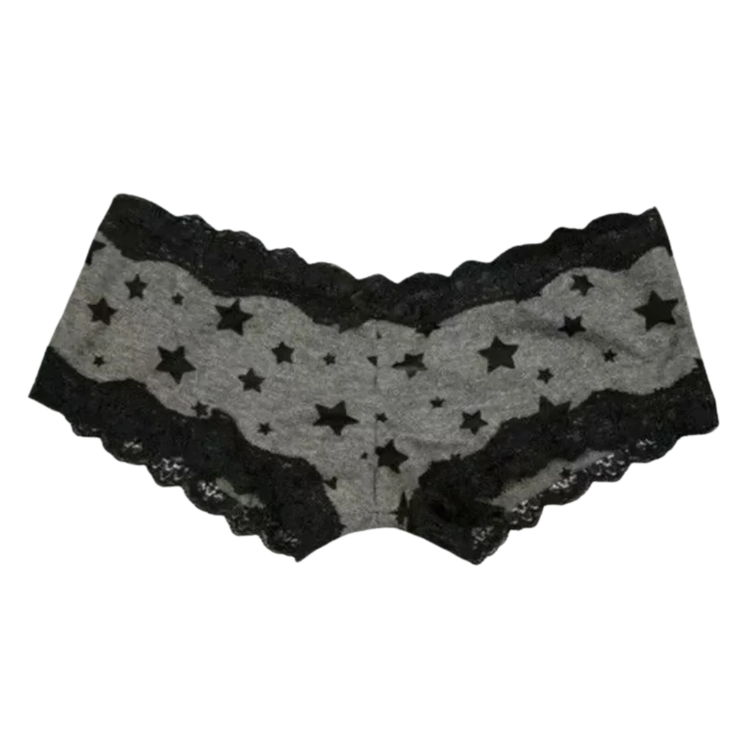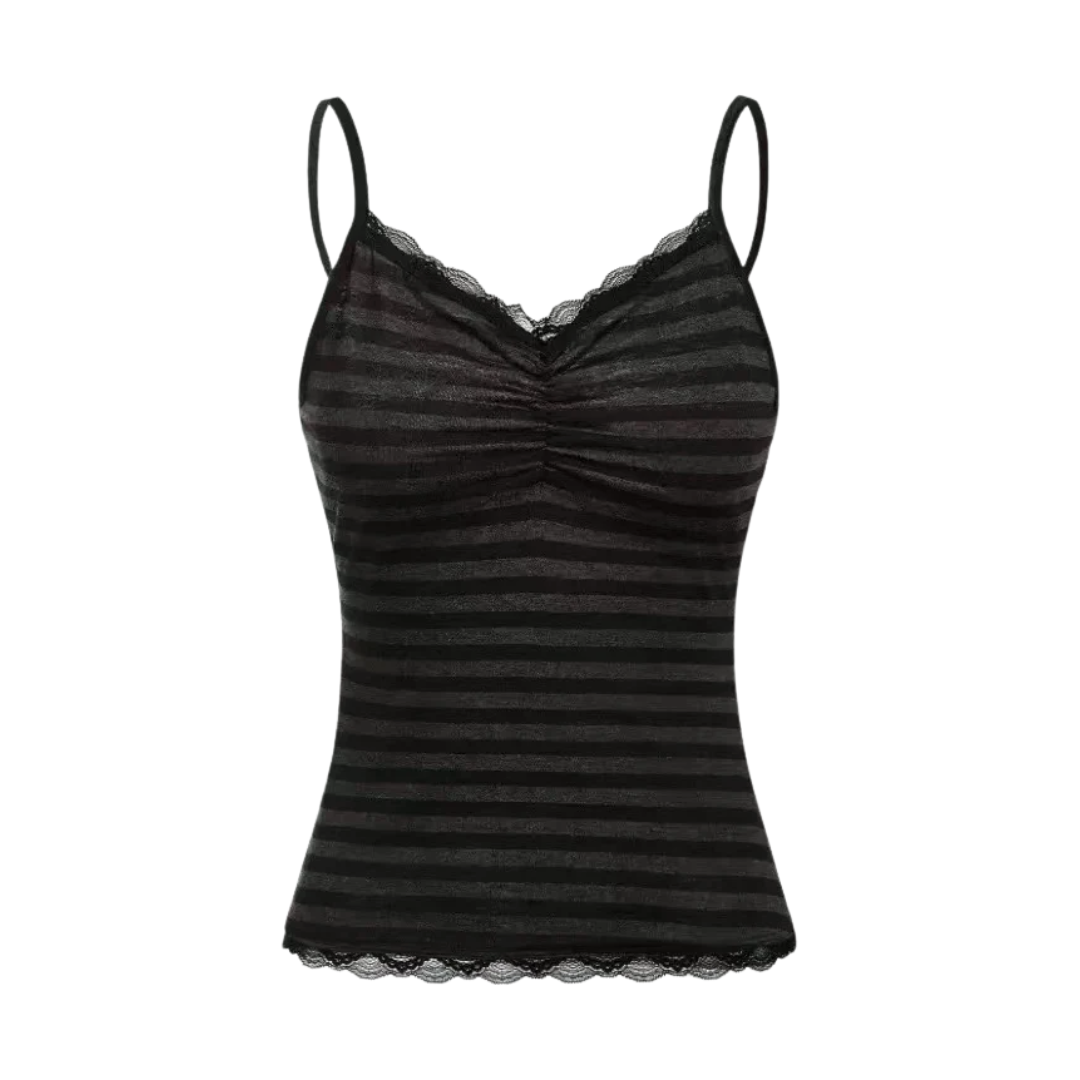 A moody charcoal stripe meets soft stretch knits and clean, feminine finishes. Choose your favorite piece or build the full look: the lace‑edged cami, star‑print boyshort, and elongated thigh‑highs.