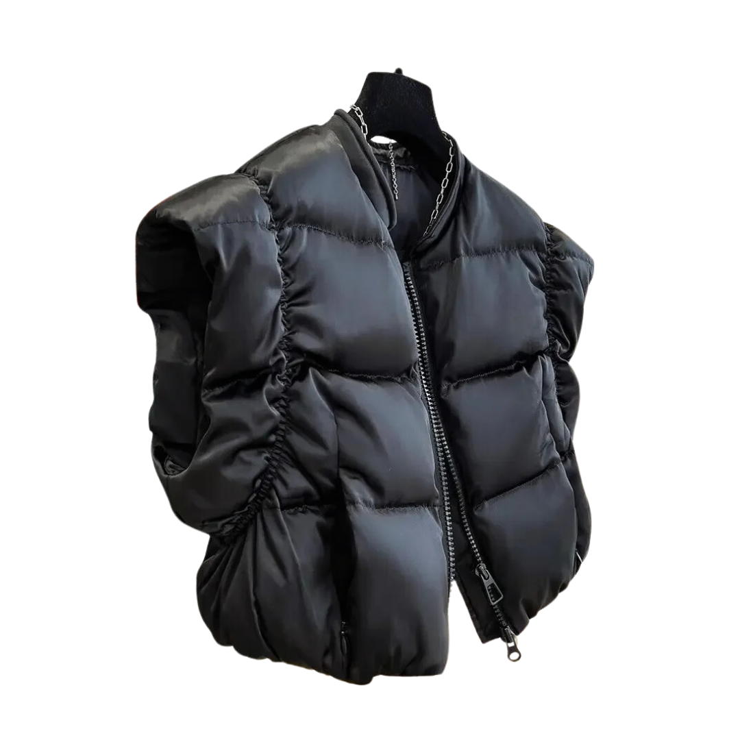 The Sculpted Puffer Vest, a masterpiece of minimalist design. The high collar and cropped silhouette create a flattering and modern look, while the lightweight yet warm synthetic fill ensures exceptional comfort.