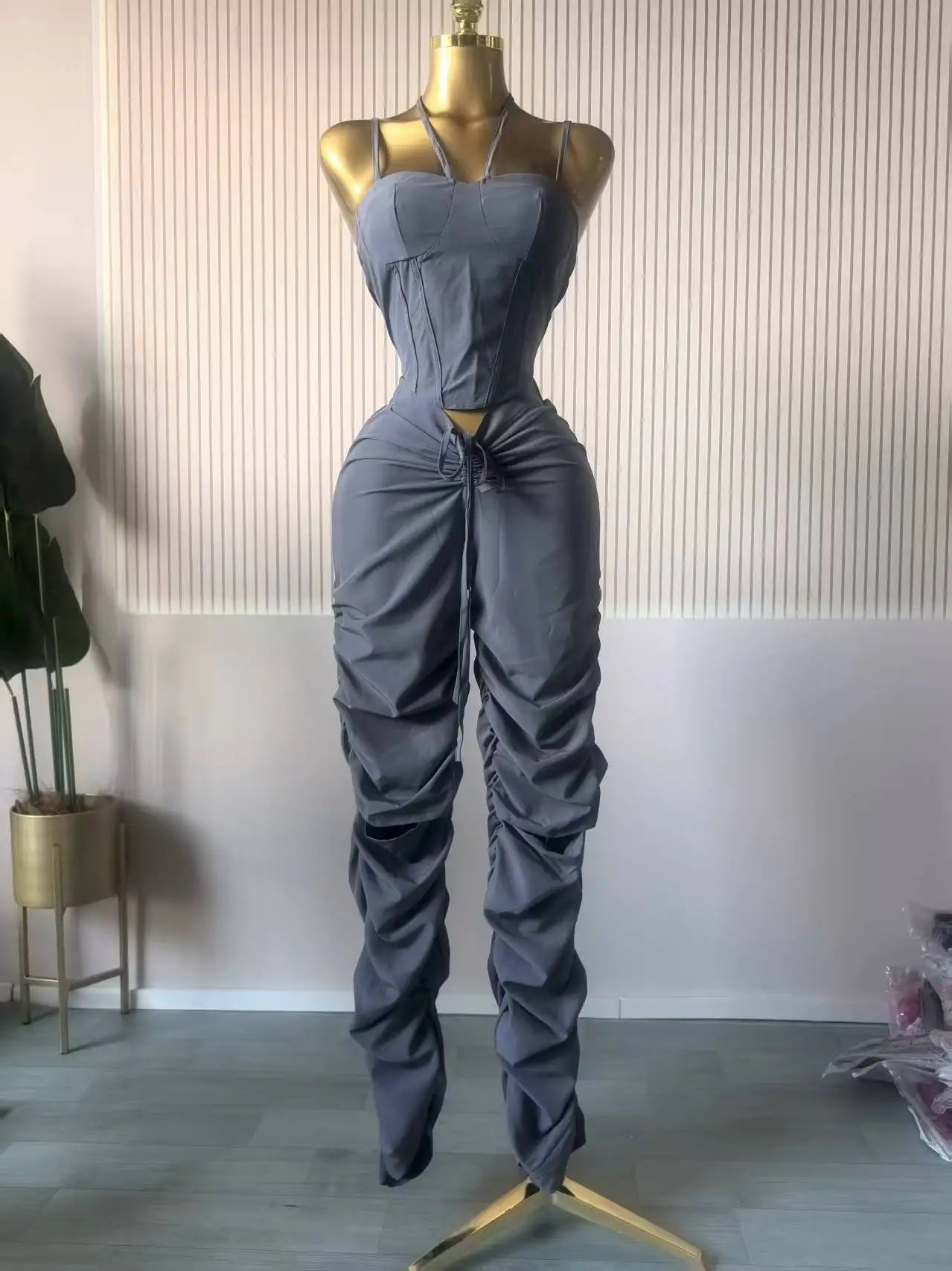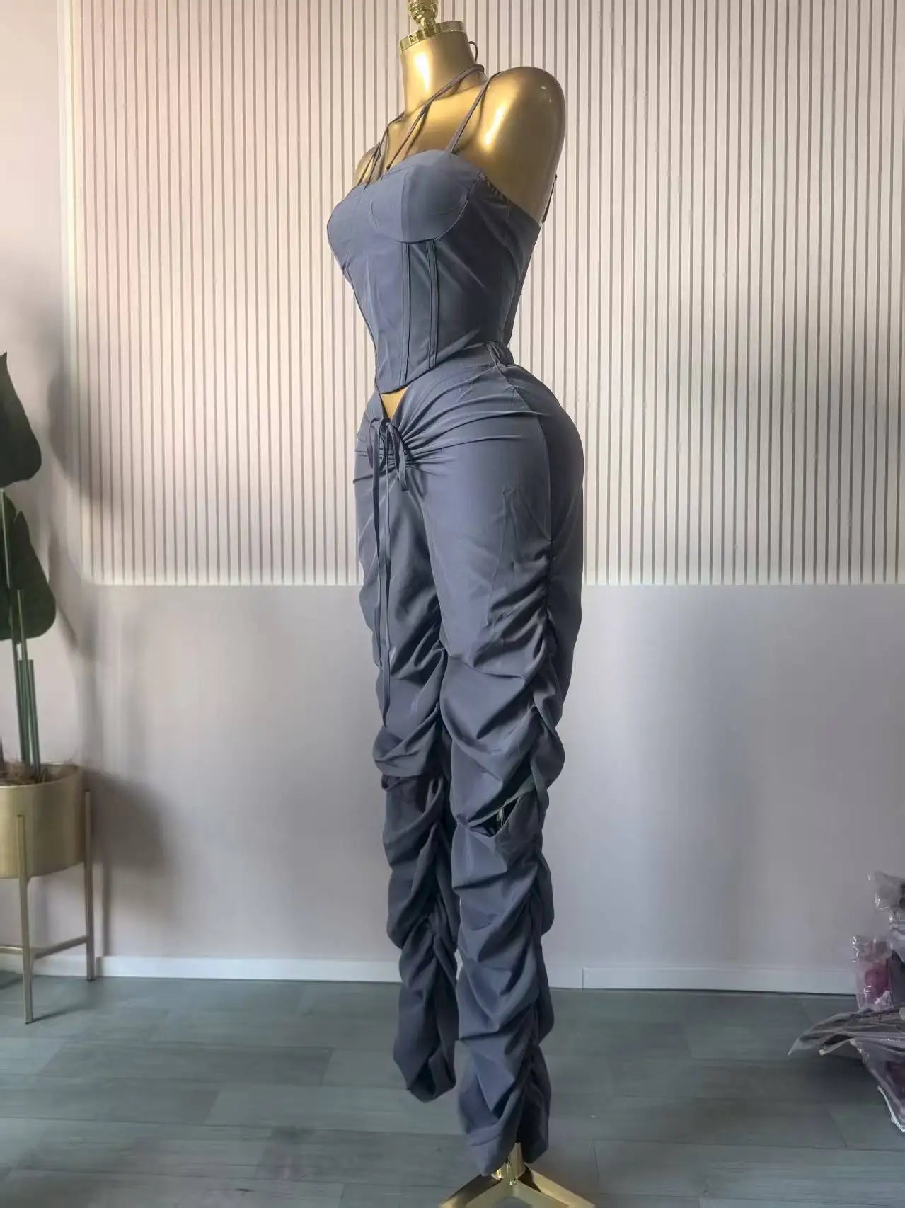 - Two‑piece set: ruched crop top and stacked‑leg pants