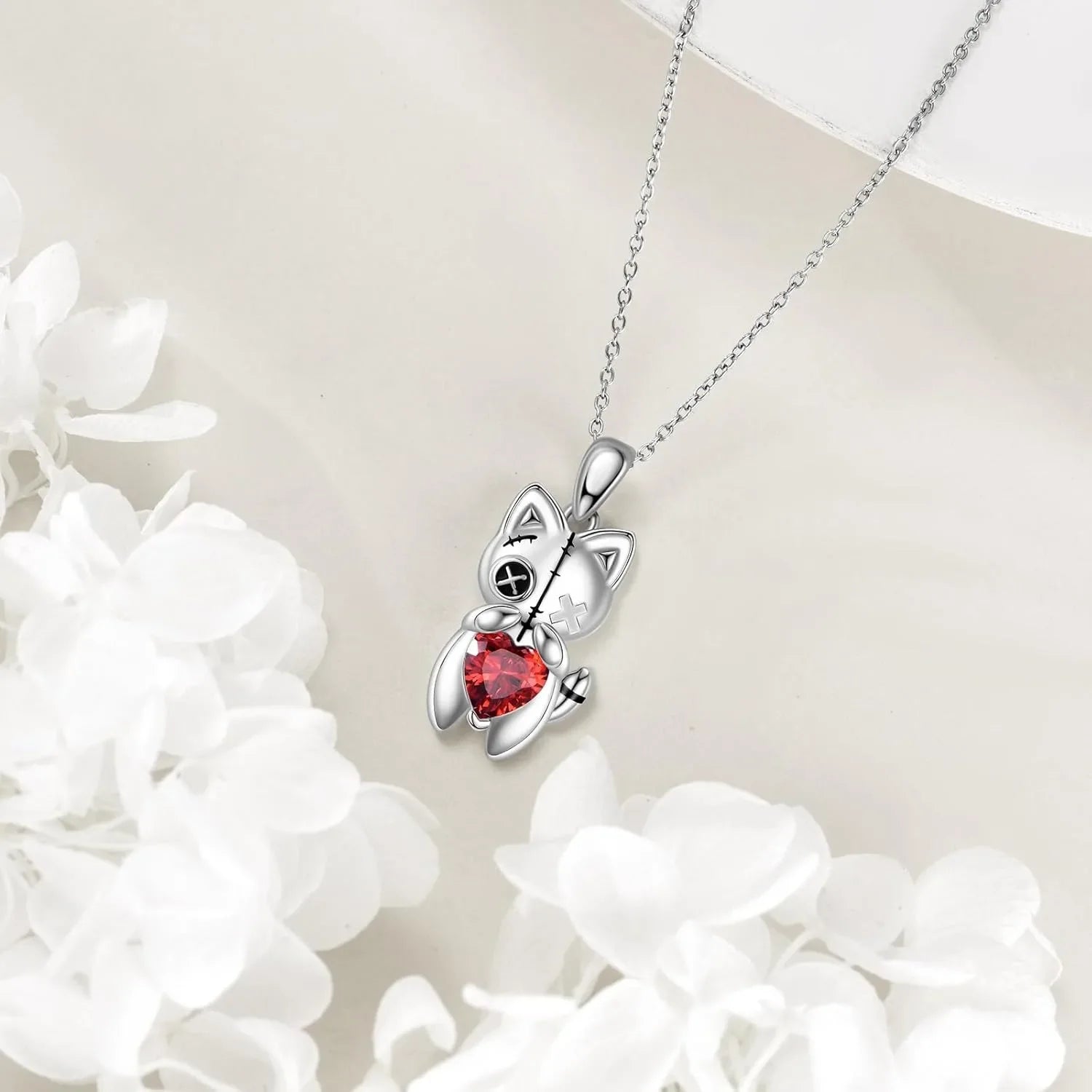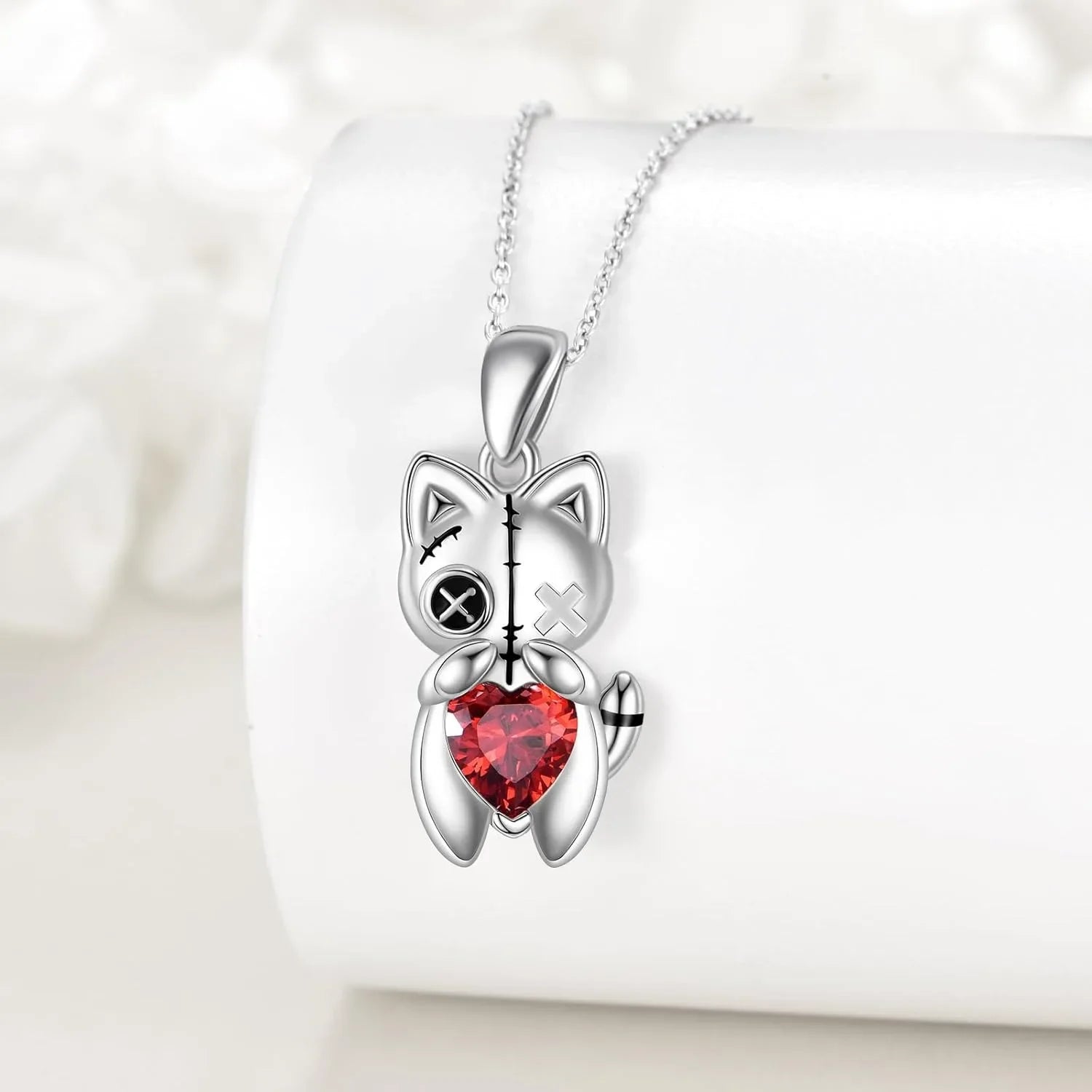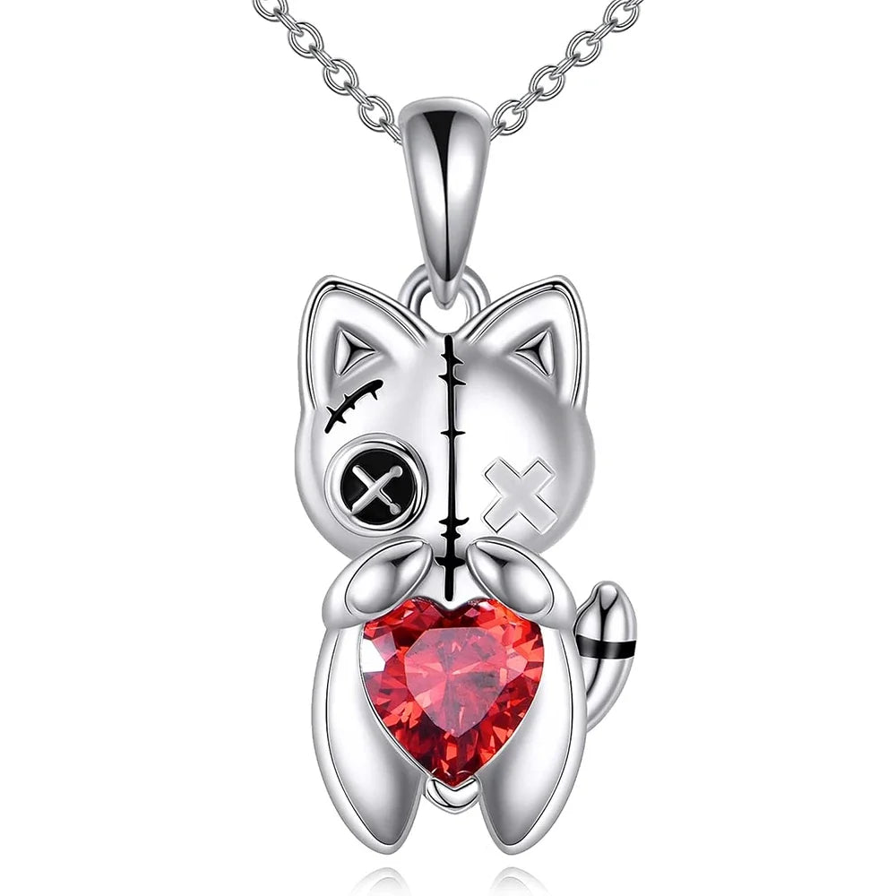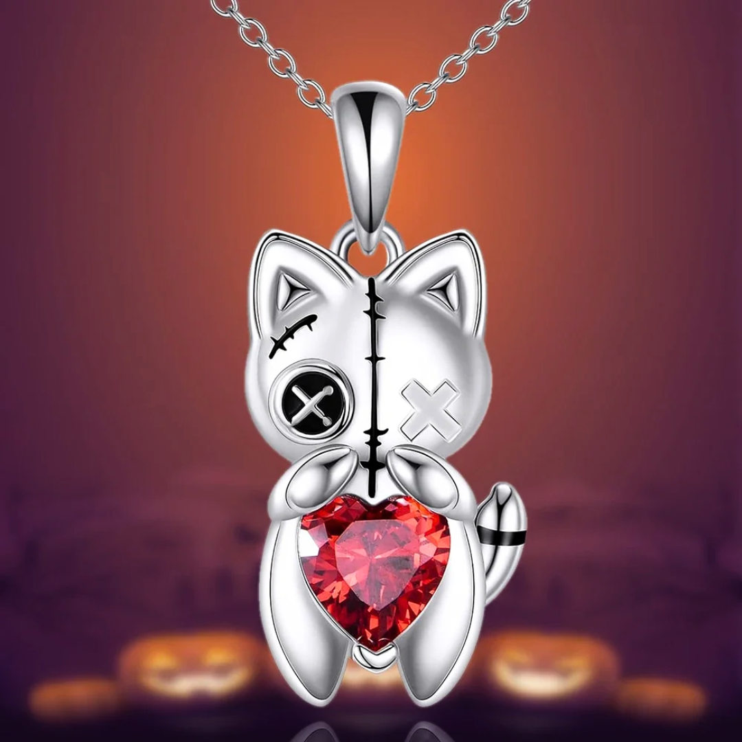 A silver‑tone cat with stitched‑eye detail hugs a ruby‑red heart for a playful, dark‑romantic touch that catches light as you move. Wear it solo or layer it for a curated charm‑necklace look.