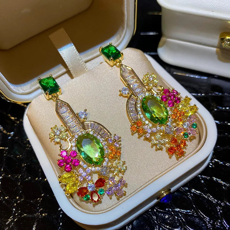 These statement drops pair an emerald‑cut stud with an oval green stone, ringed by pavé floral accents in rich jewel tones. Finished in polished gold‑tone plating, they add color and light to simple knits or an evening slip.