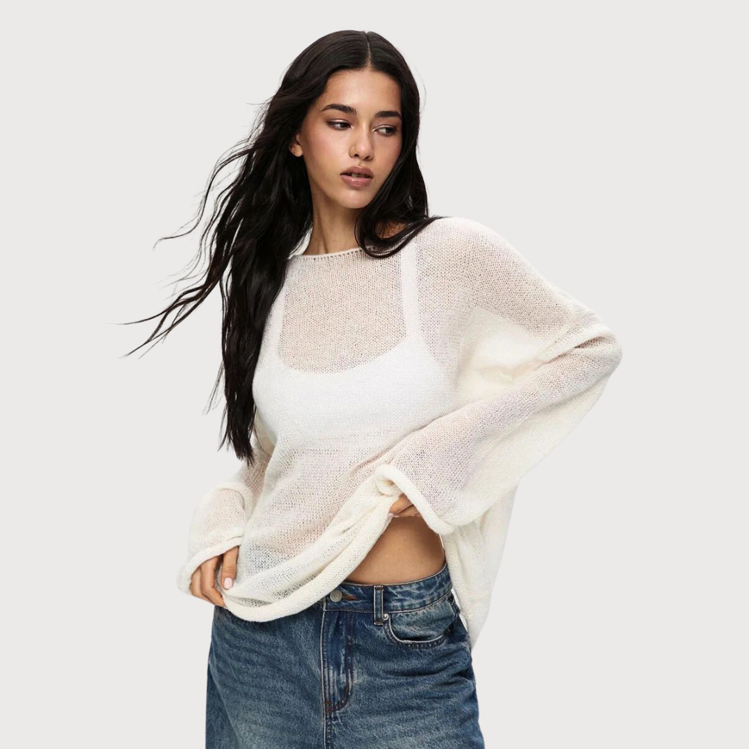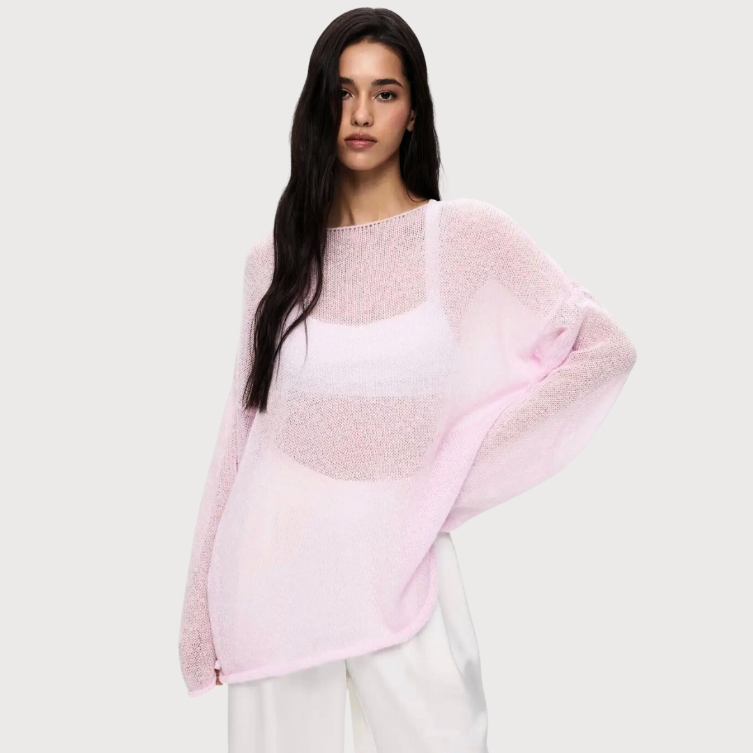 Meticulously crafted from a unique blend of yarns for softness, featuring a luxuriously loose fit in soft pastel pink or crisp white that flatters any silhouette, seamlessly transitioning from day to evening wear.
