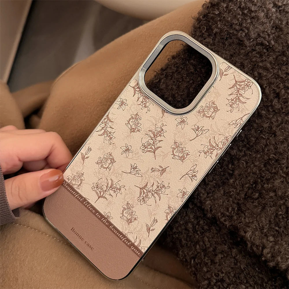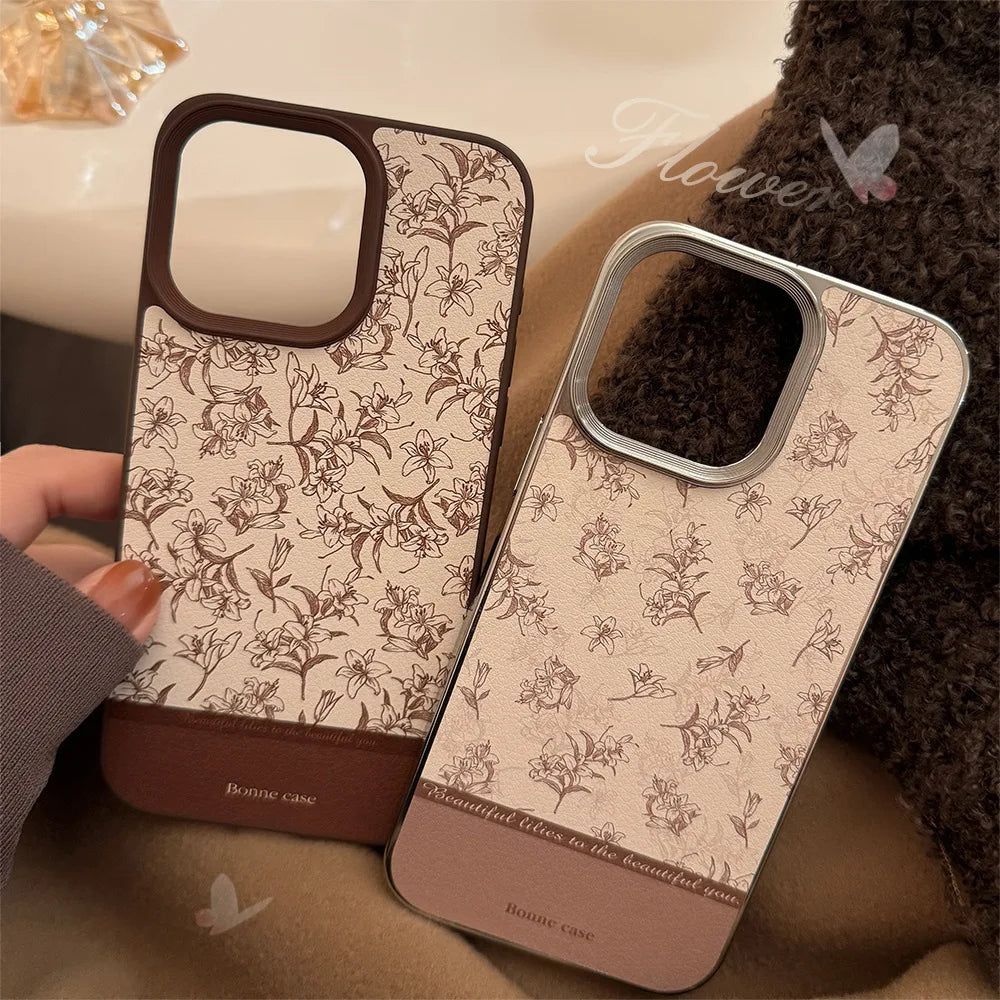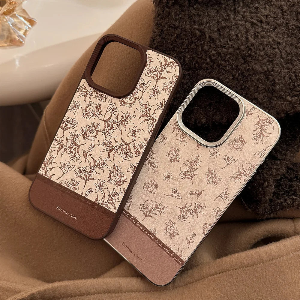 Vintage‑style lilies are micro‑etched into a sand‑beige leather‑touch panel, framed by cocoa color‑block edging that hides a slim shock bumper yet still snaps clean to MagSafe.
