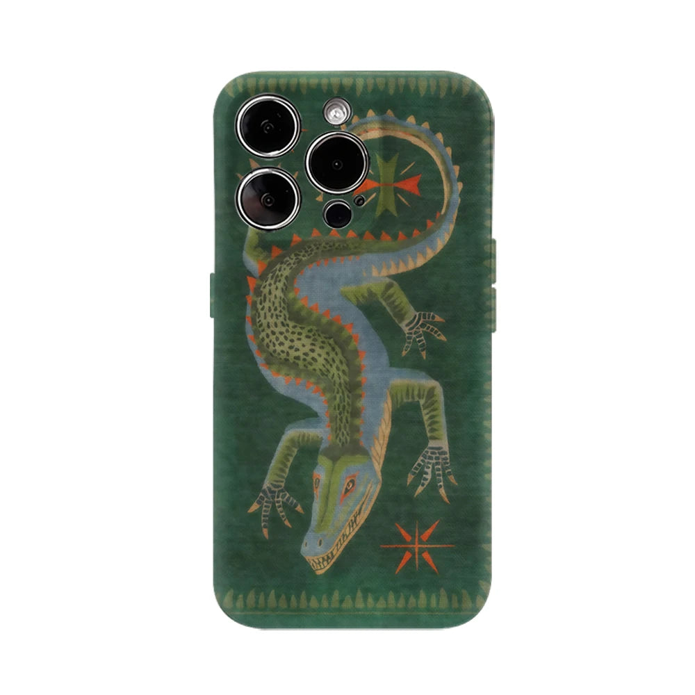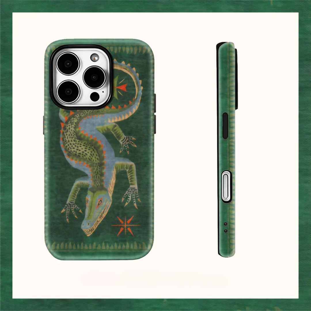 Vintage‑inspired reptile artwork meets modern protection in a double‑layer case with a tactile, satin‑matte finish. A rigid back plate and shock‑absorbing frame lock in museum‑grade print while keeping pockets slim.