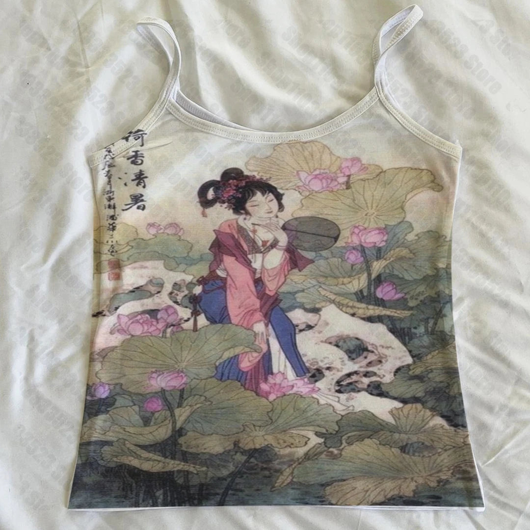 Stretch‑cotton rib hugs close while a high‑resolution print of Tang‑era maidens and lotus blooms turns this cropped cami into wearable art with a Y2K edge.