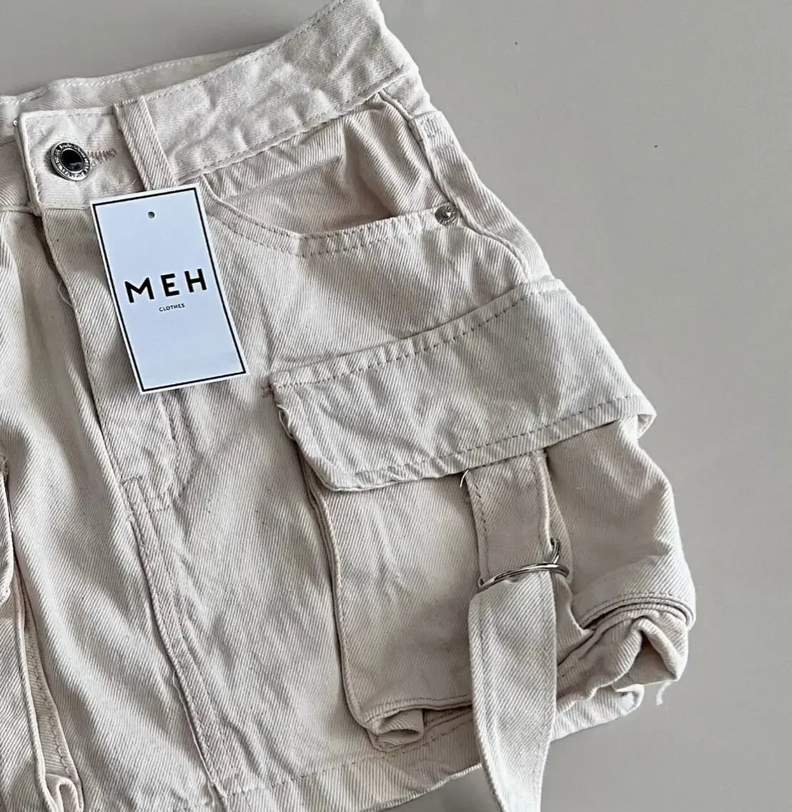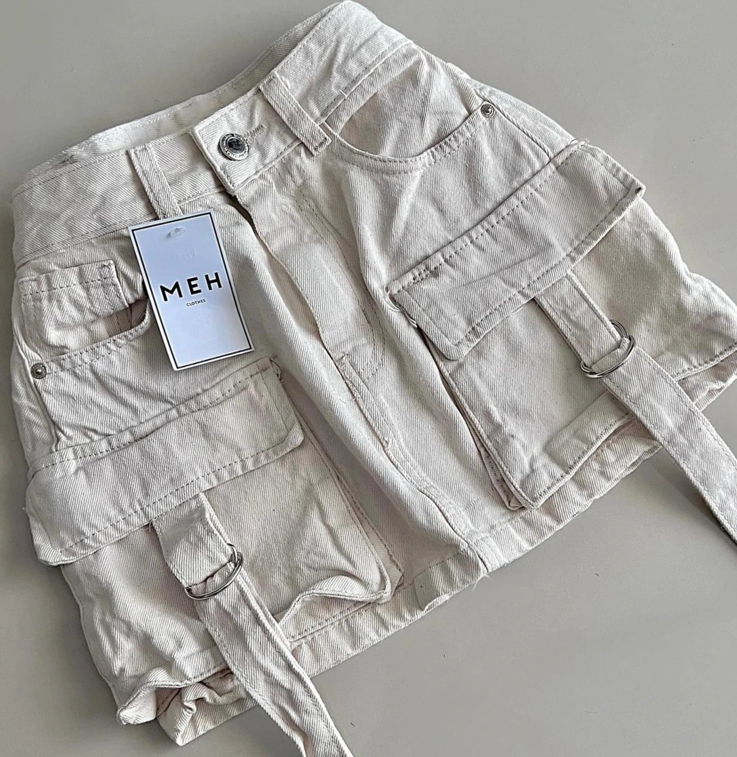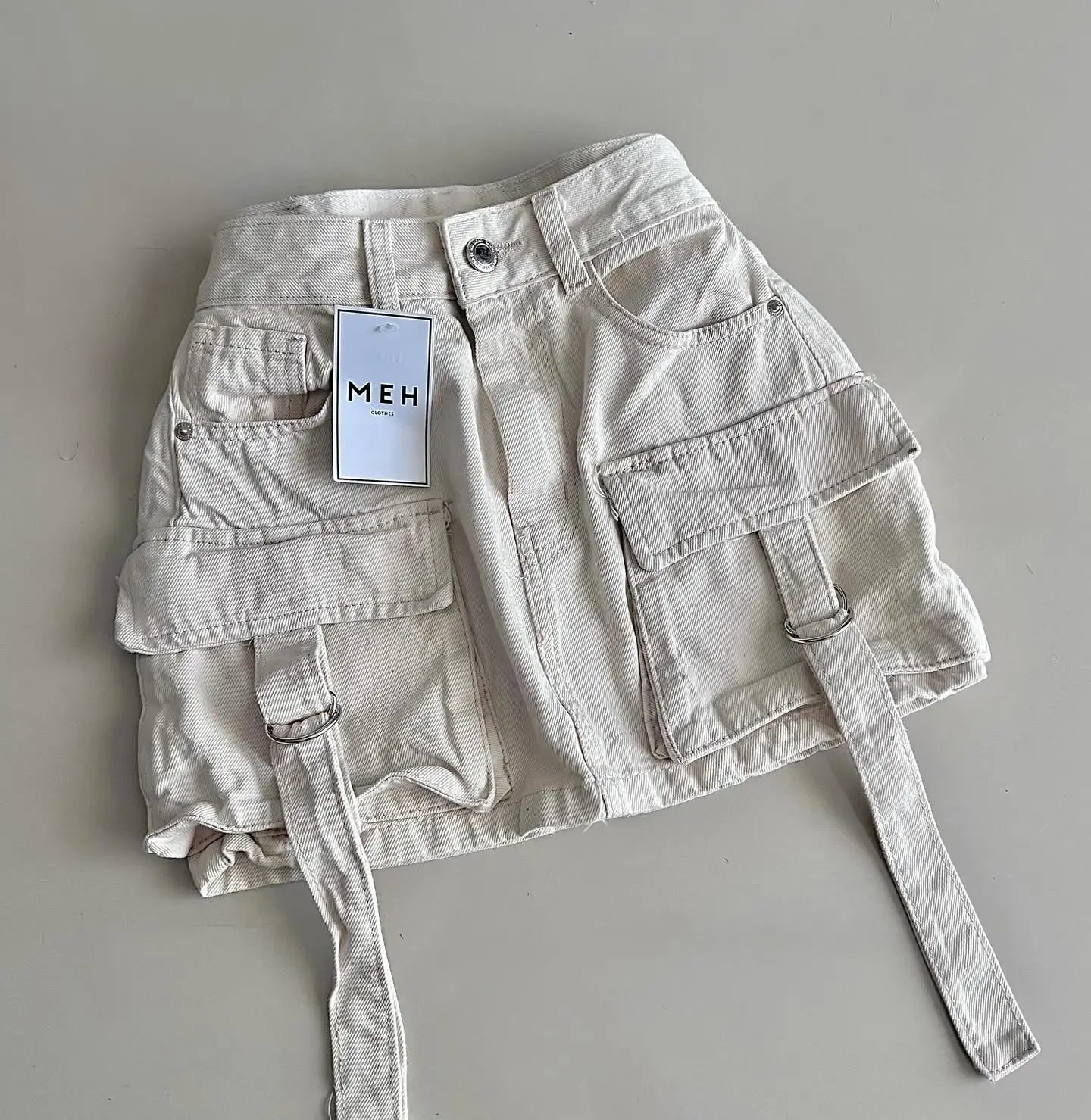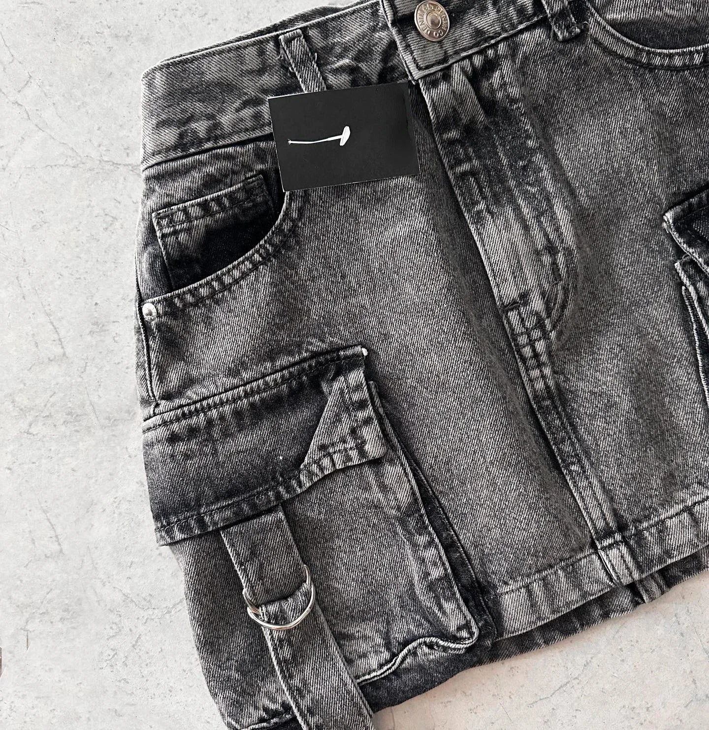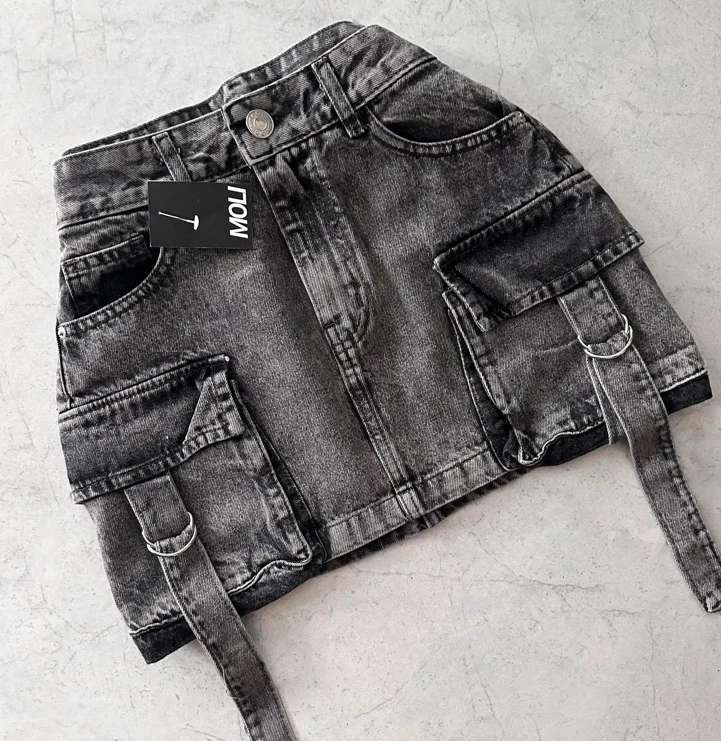 A fusion of punk rock attitude and streetwear cool. With its edgy pockets, distressed denim, and ultra-short length, this skirt is ready to turn heads and break the rules.
