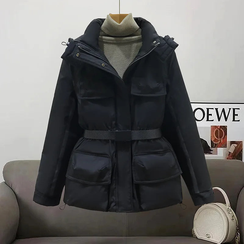 A warm, waist‑defining winter jacket with a removable belt, oversized hood, and deep pockets. Quilted insulation and a windproof shell keep you cozy without the bulk.