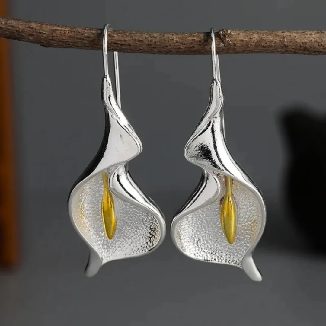 These striking silver earrings from Lueur feature a unique, fluid design reminiscent of shimmering droplets or delicate leaves. A pop of vibrant yellow at the center adds a playful touch to the elegant silver, creating a captivating statement piece.