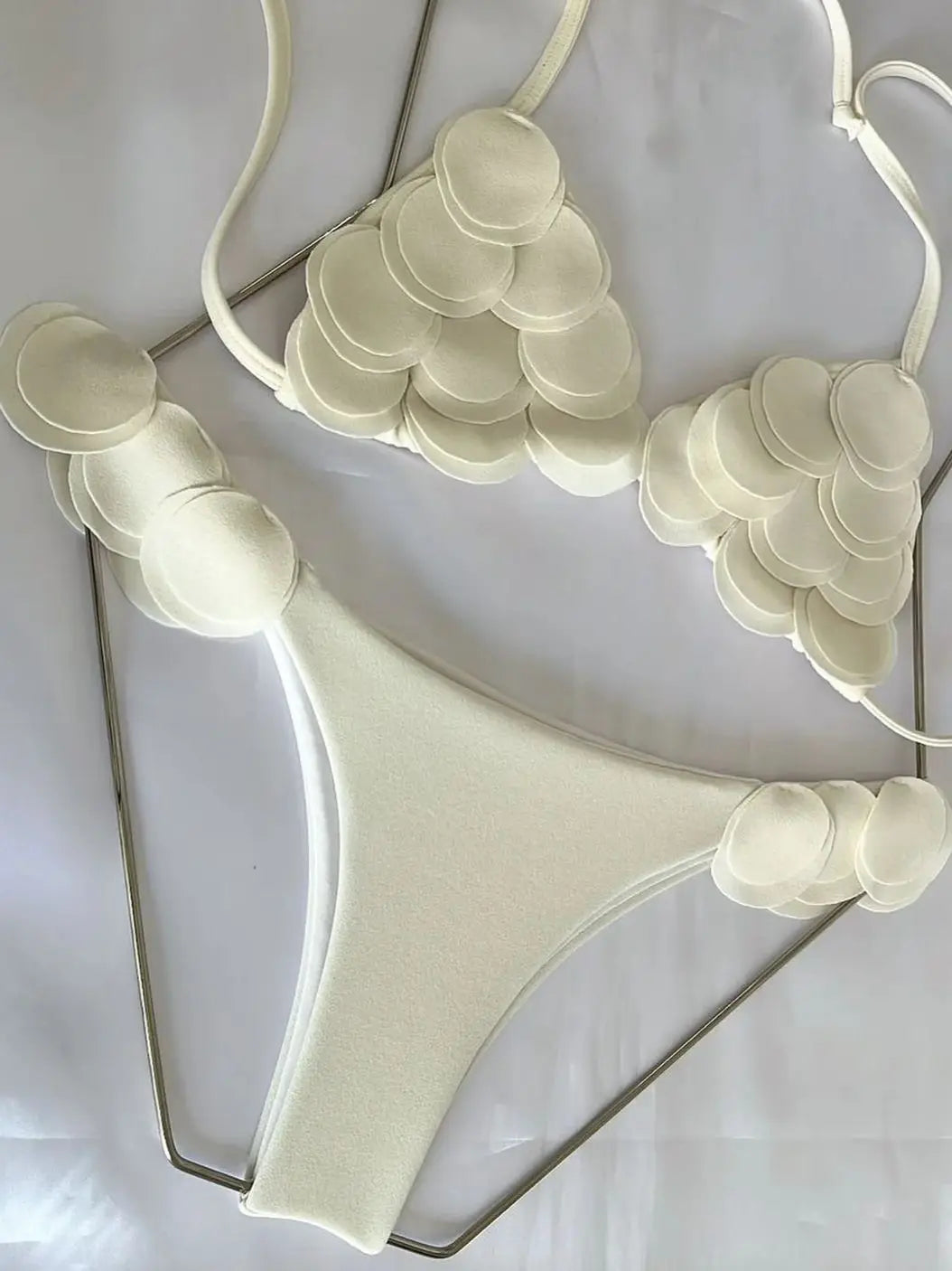 Embrace sun-soaked days in this delicately scalloped bikini set, adorned with a unique frill design that mimics the gentle waves of the ocean. Crafted for elegance and comfort, its halter neck and Brazilian cut ensure a flattering fit for every figure.