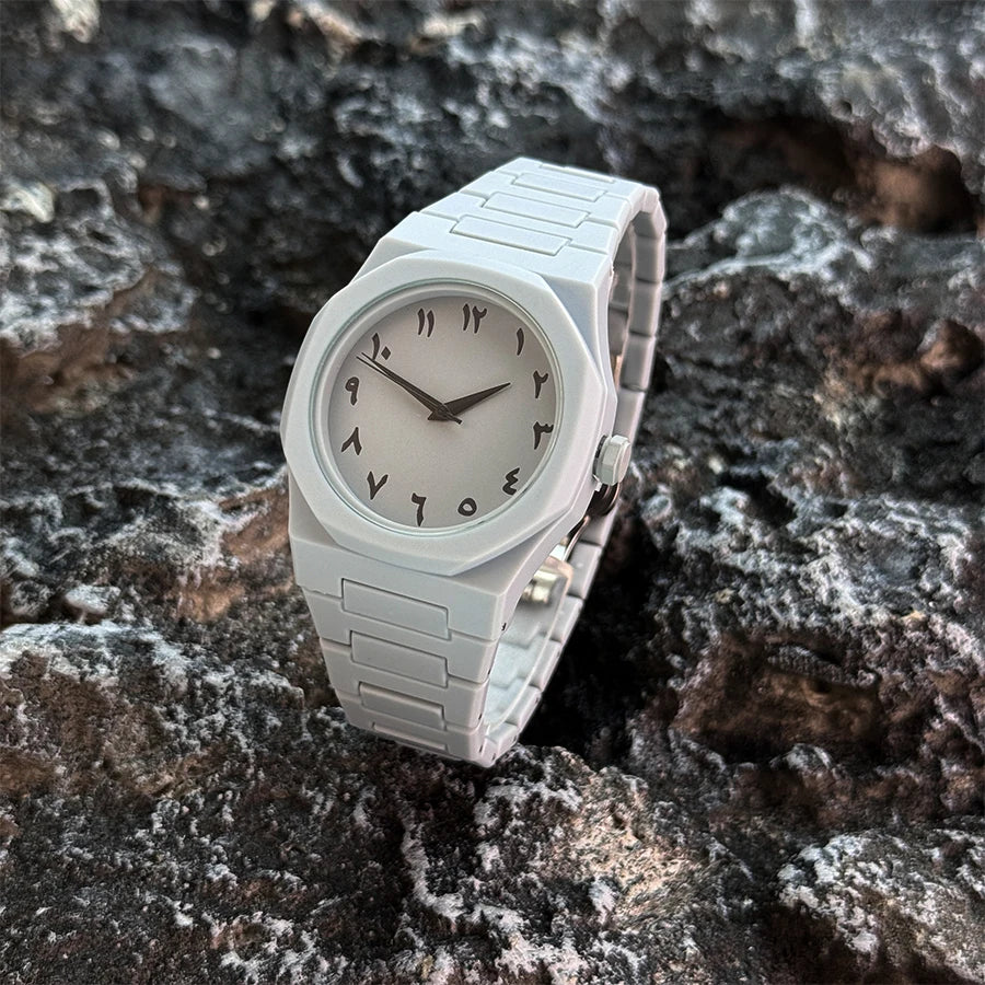 A crisp, monochrome take on everyday timekeeping. Qamar sets a clean Arabic‑numeral dial inside a slim, integrated silhouette, driven by a reliable quartz movement that keeps your day perfectly paced.