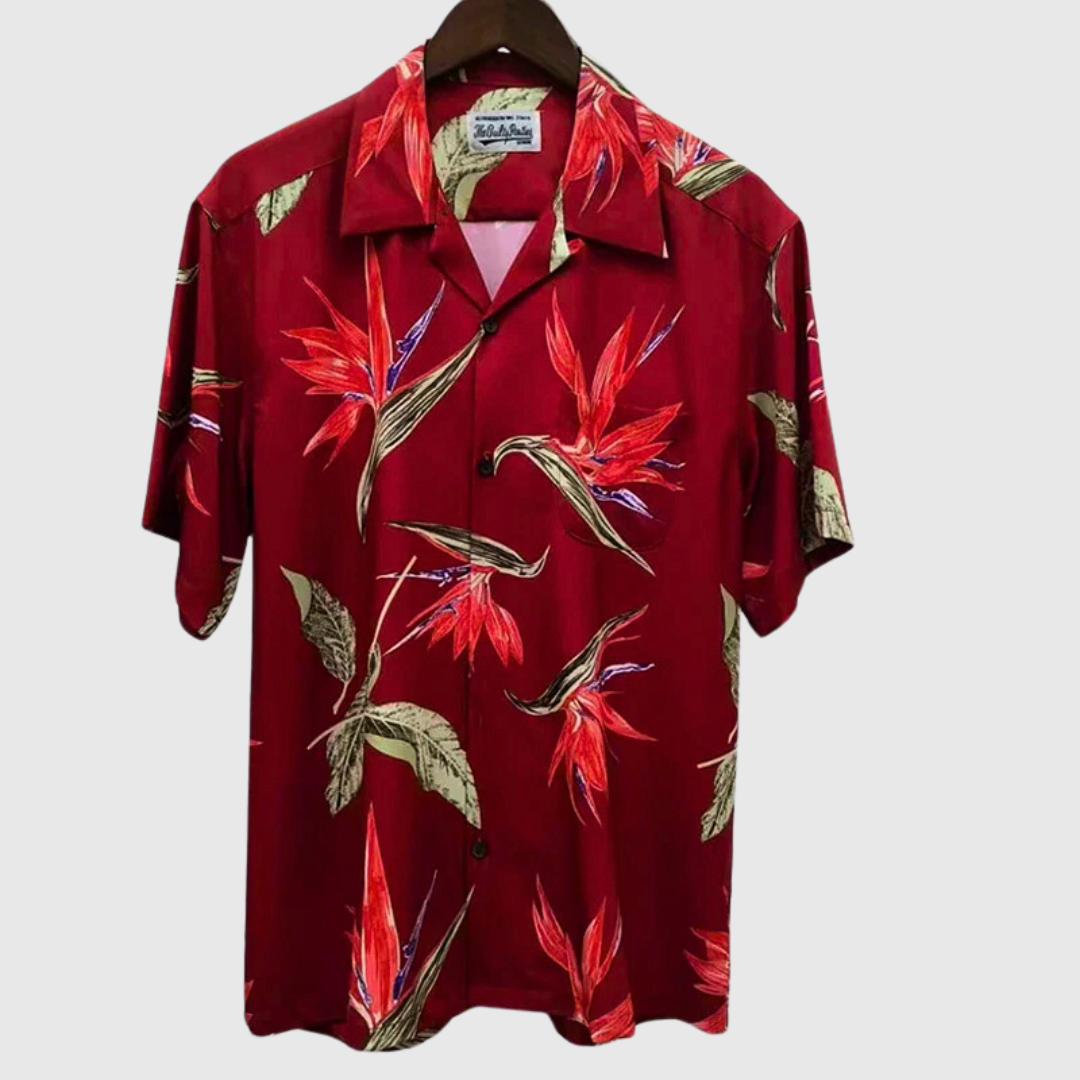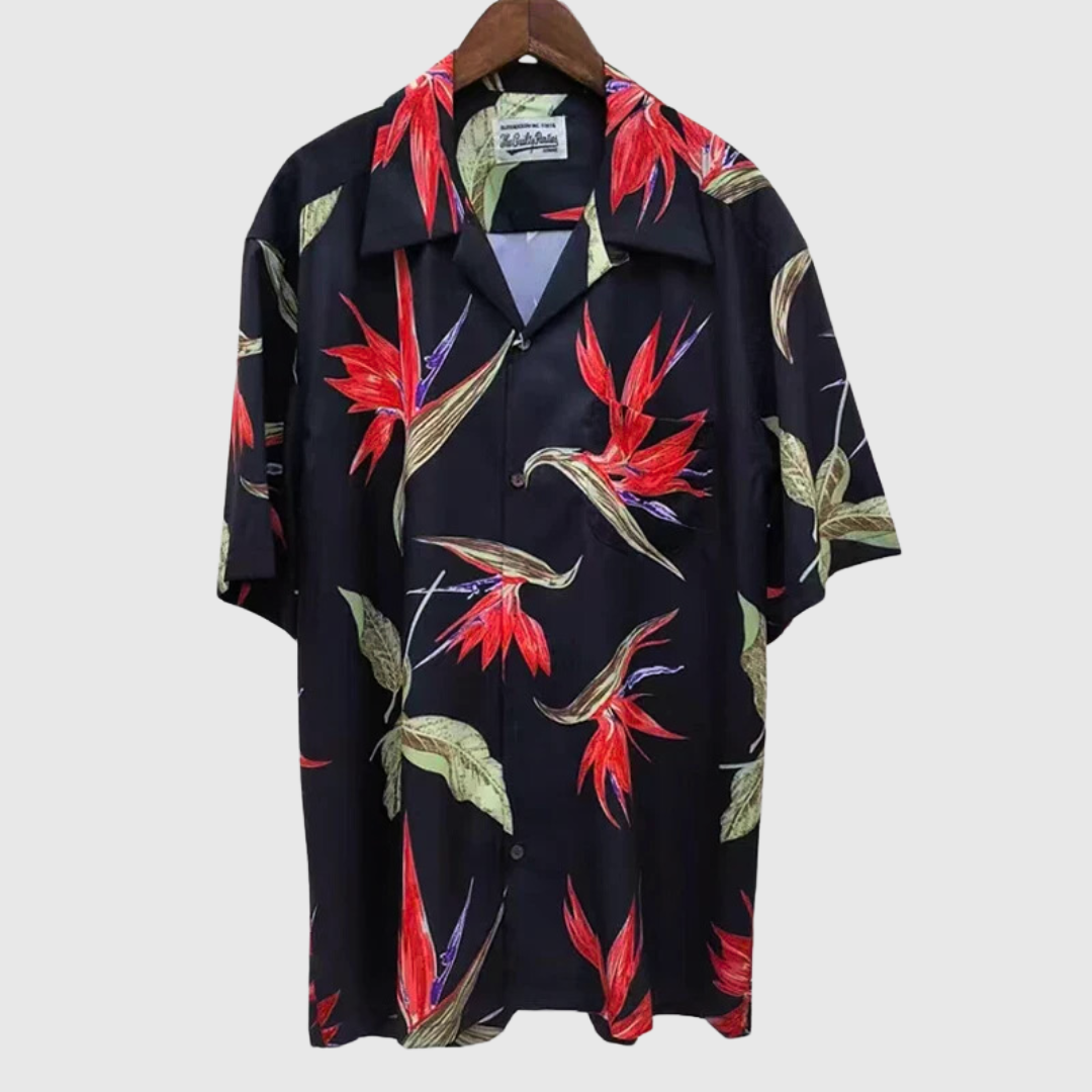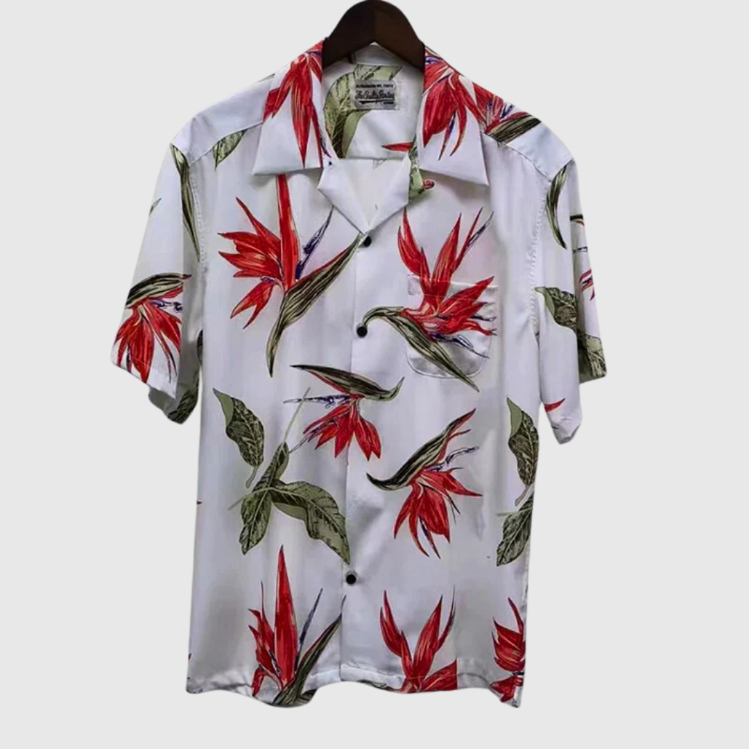 These exquisite short-sleeve shirts feature a stunning botanical print showcasing vibrant bird-of-paradise flowers and lush leaves in rich reds and greens. Available in three eye-catching background colors - crisp white, classic black, and bold red - these shirts offer versatile styling options for any occasion.