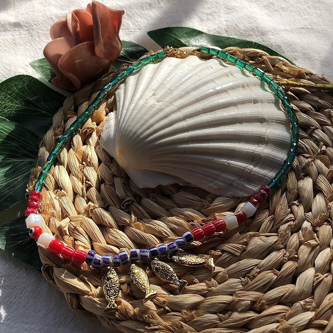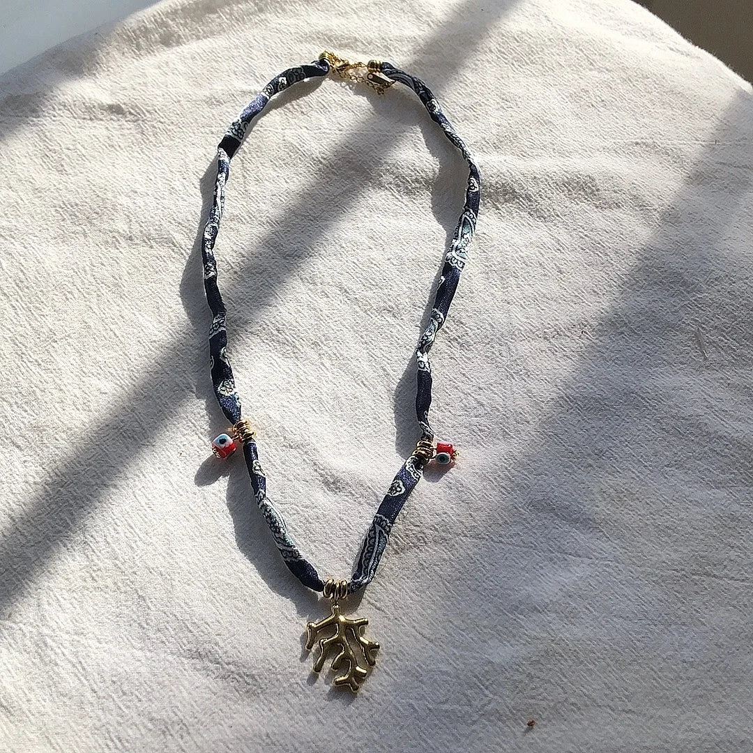 A midnight‑indigo bandana cord is hand‑twisted with vermilion seed beads and miniature gilded fish, centring a sculpted coral medallion that shimmers with sun‑washed gold. The adjustable slide clasp lets the piece skim the collarbone or sit higher as a choker, taking you from yacht deck to sunset aperitivo in effortless Riviera glamour.