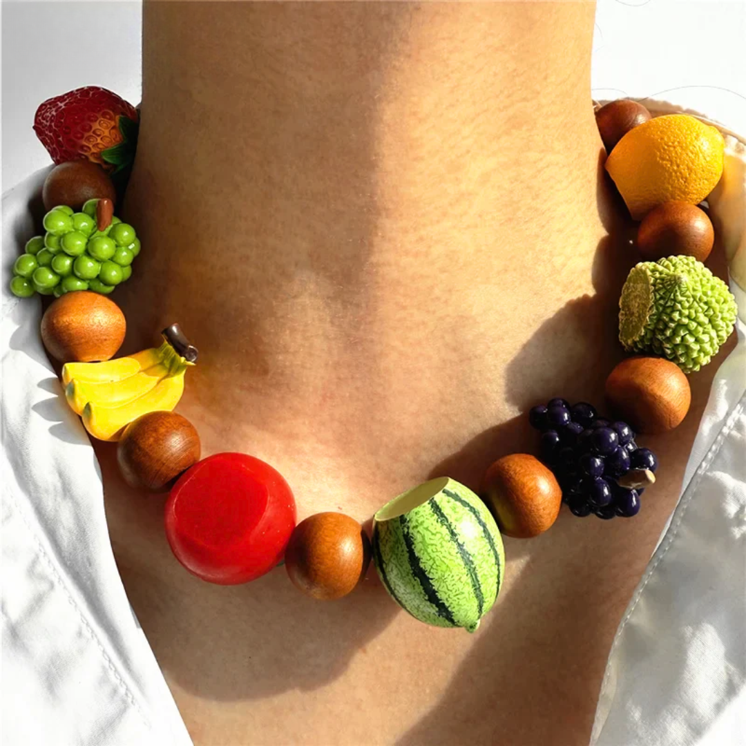 This short strand threads glossy resin fruit charms—watermelon, banana, strawberry, durian and grapes—between smooth wooden beads for a bright, nostalgic finish. Wear it to lift simple tees and slip dresses.