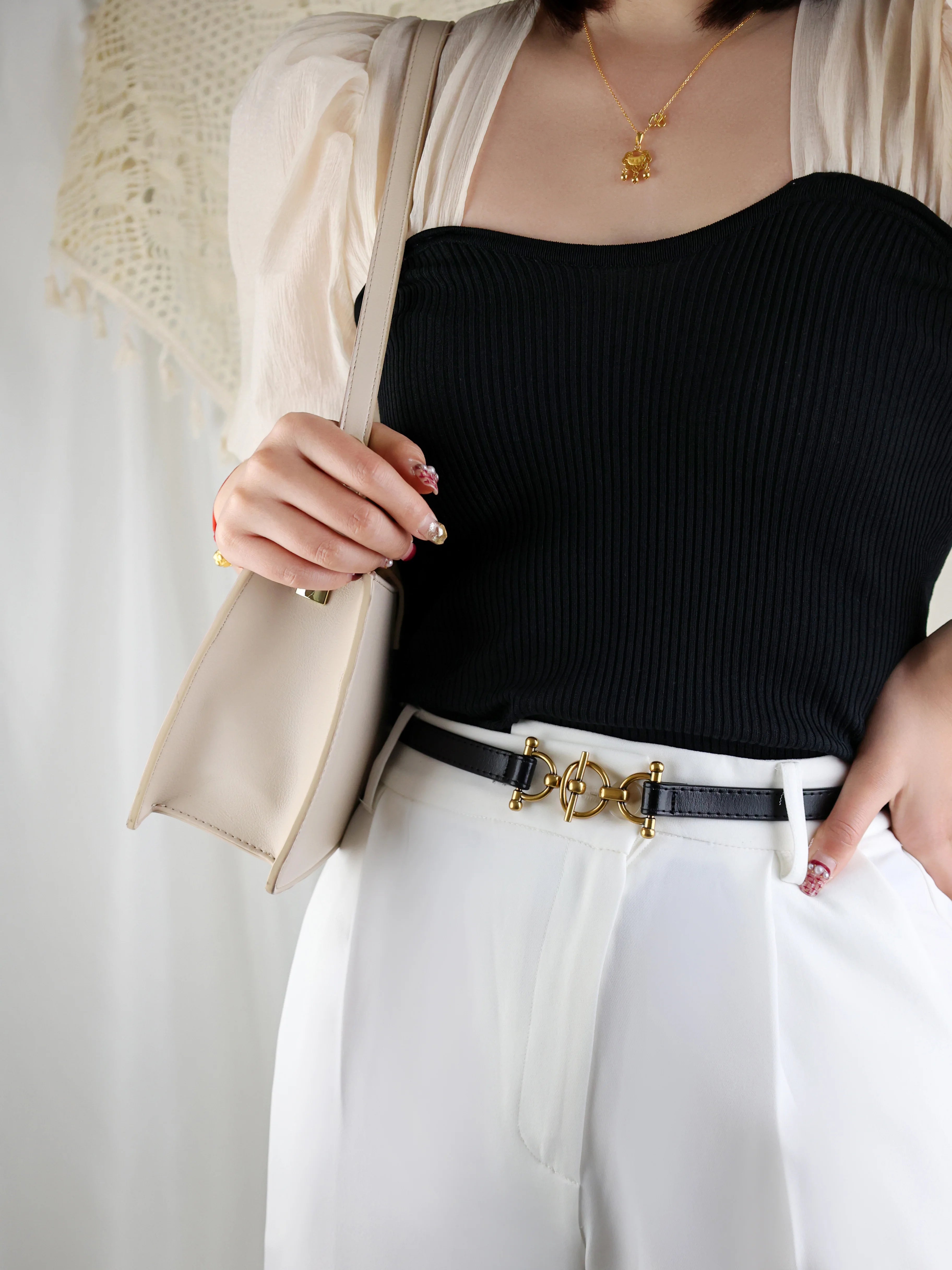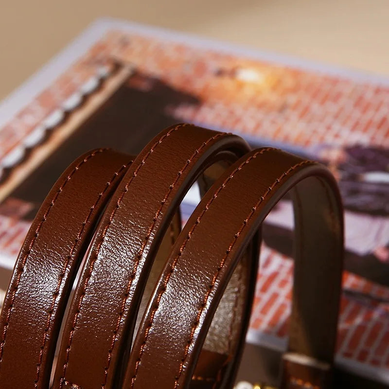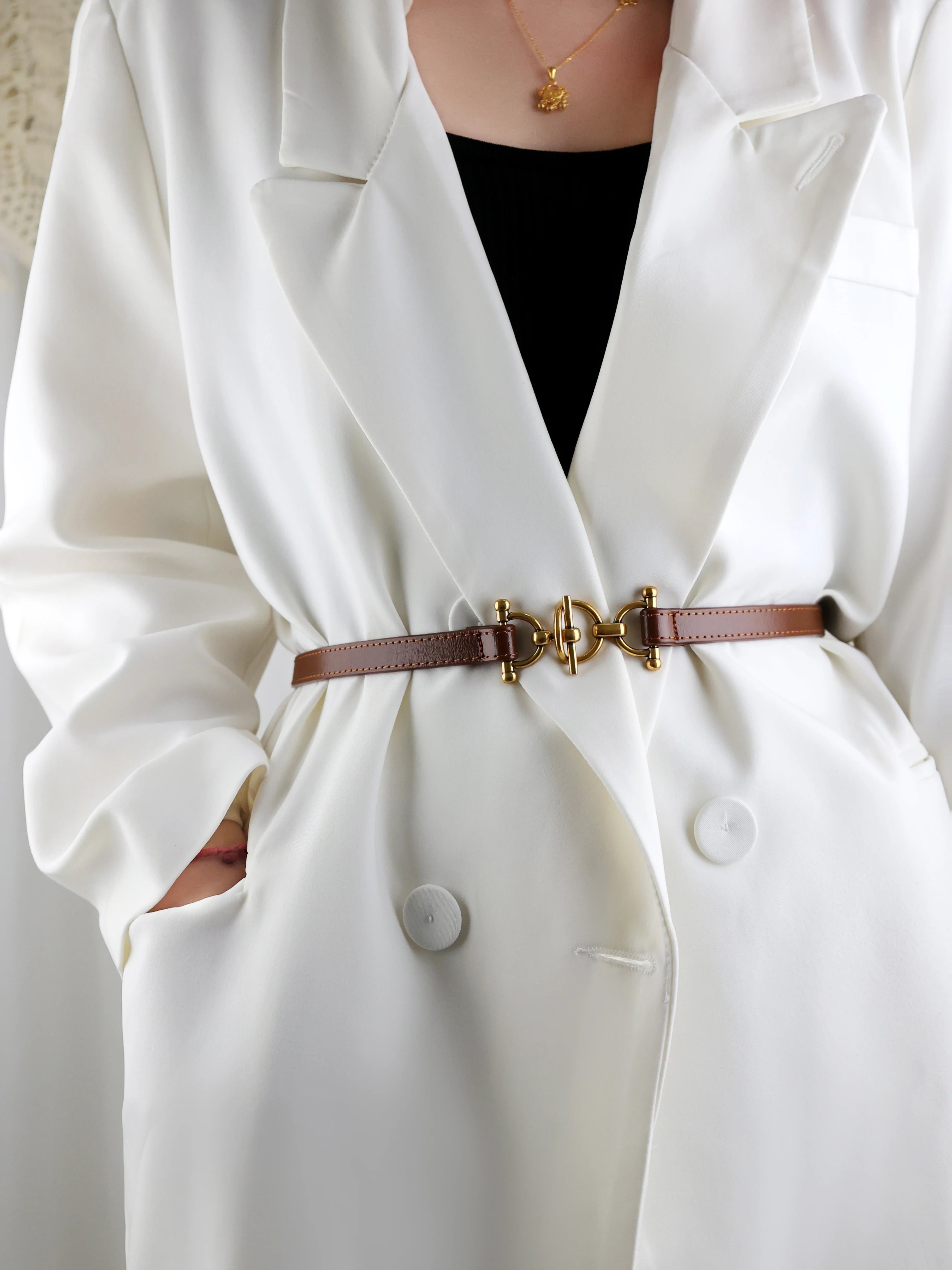 Supple, micro‑grain leather wraps the waist with an equestrian‑inspired bit clasp in hand‑polished gold, cinching everything from slip dresses to oversized blazers with discreet, old‑money shine.