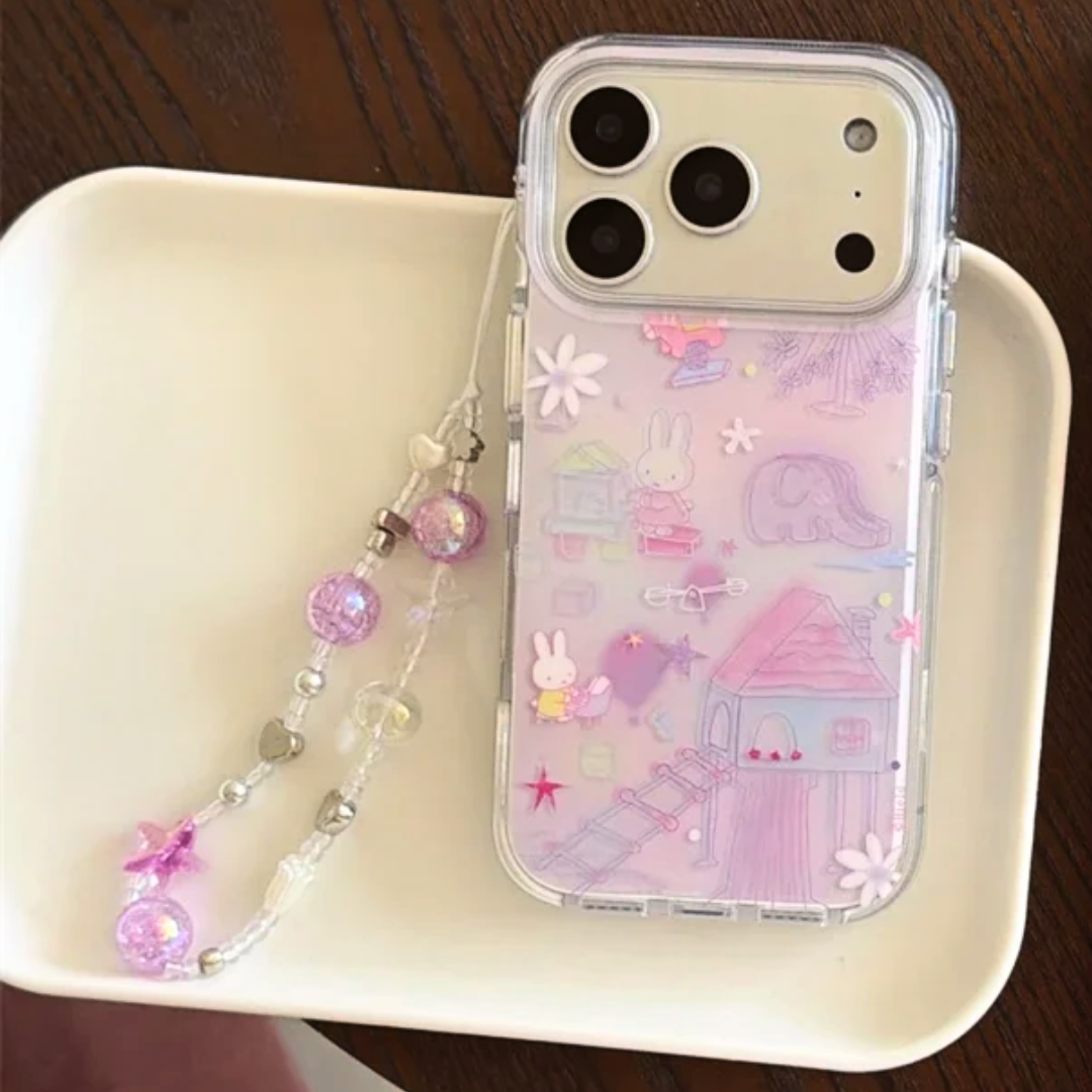 A plush little bunny sits atop a satin‑pink, quilted pattern, and the detachable chain lets you carry your phone like a mini bag. The sculpted heart grip pops for secure one‑hand photos and folds flat in your pocket.