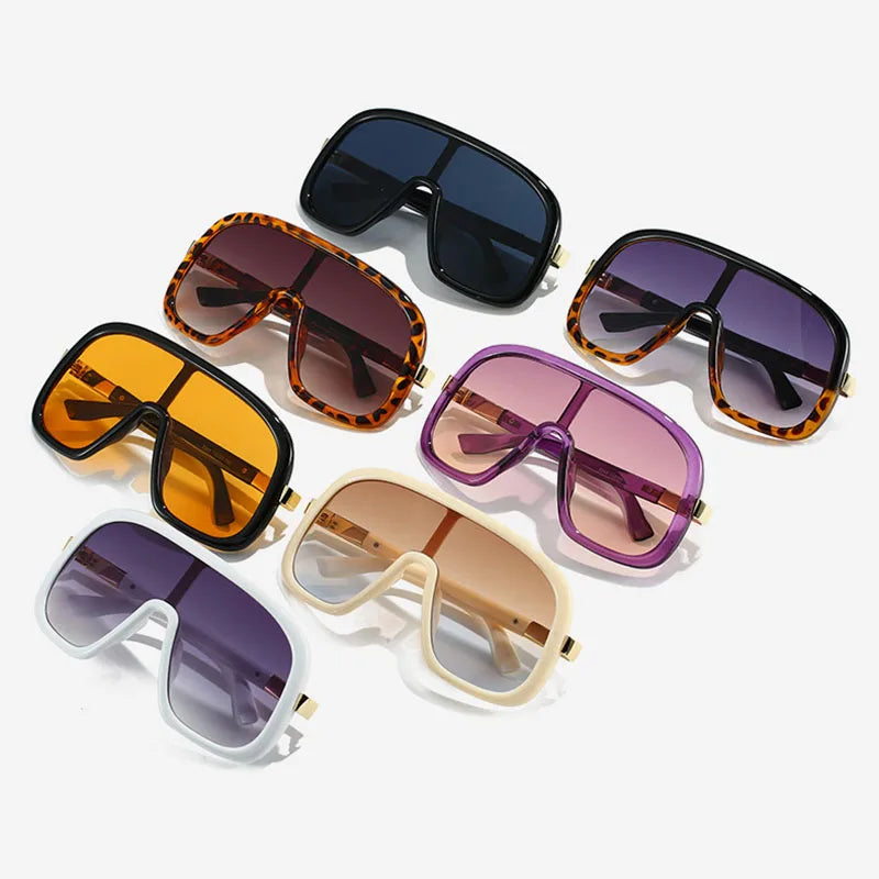 An oversized, single‑span lens curves in a fluid arc, shifting from deep amethyst to champagne dusk. Polished acetate arms slip into gold‑toned metal cores for a weightless, balanced fit, while a discreet nose‑bridge ridge keeps the shield floating just off the skin. Panoramic UV400 gradient lens
