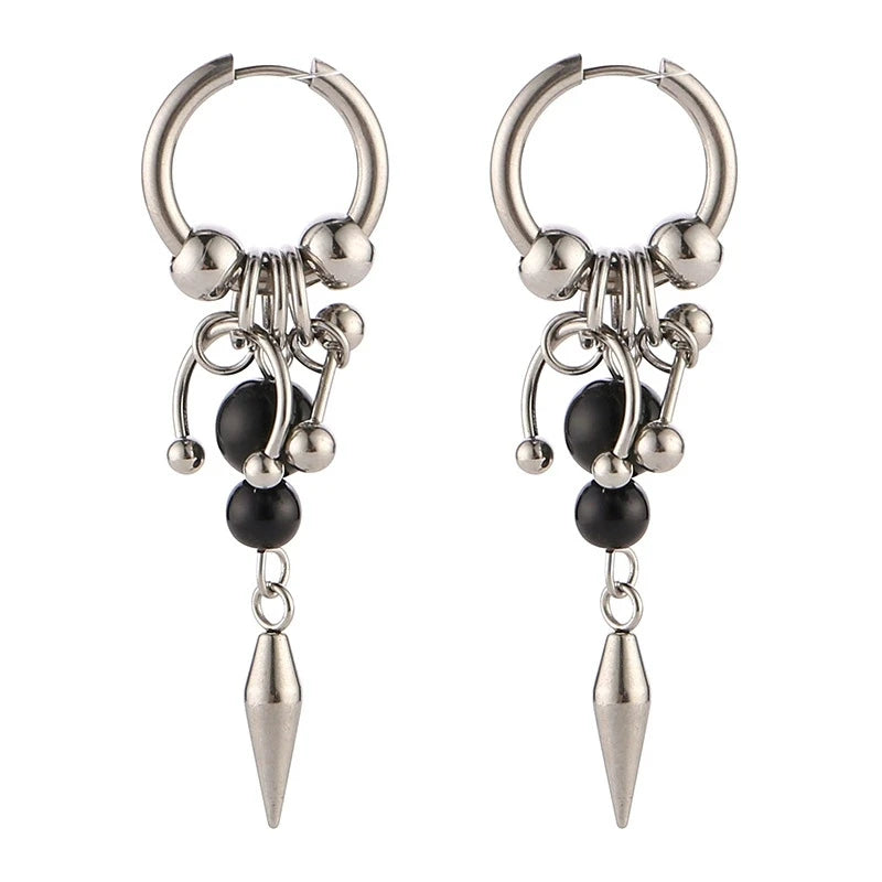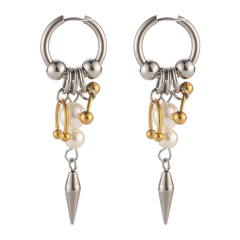 A decadent clash of street and salon: polished 316L steel hoops draped with mixed‑metal charms, glass pearls and a sleek spear drop. Light on the ear yet heavy on attitude, they’re the perfect finishing touch for grunge, goth or glam nights out.