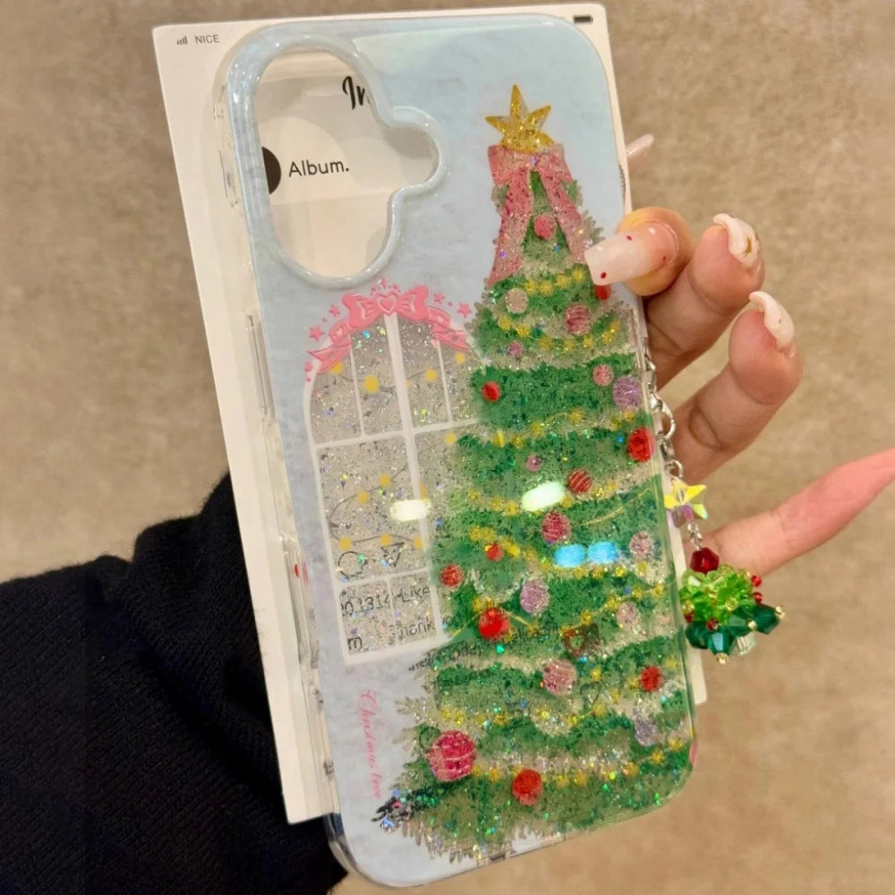 Bring holiday magic to your mirror selfies. A 3D Christmas‑tree illustration with embedded crystal sequins sits over a clear anti‑yellow back, while soft shock‑absorbing sides and a raised camera bezel keep your iPhone protected and sparkling.