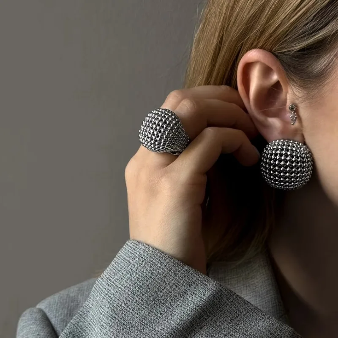 This matching set features oversized mesh‑ball studs and a coordinating dome ring, both covered in tiny steel beads that catch the light with every move. The pieces look bold but clean, giving a modern, sculptural feel that works with blazers, slip dresses, and simple tees.