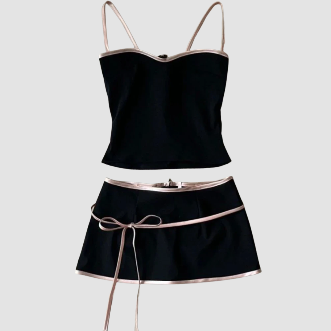 A sleek black cami top and mini skirt are edged in soft blush satin piping, with a tiny bow at the neckline and a slim tie belt that wraps the waist. The fabric skims the body without clinging, giving a clean, simple silhouette that works for holiday dinners, dates, or night-out photos.