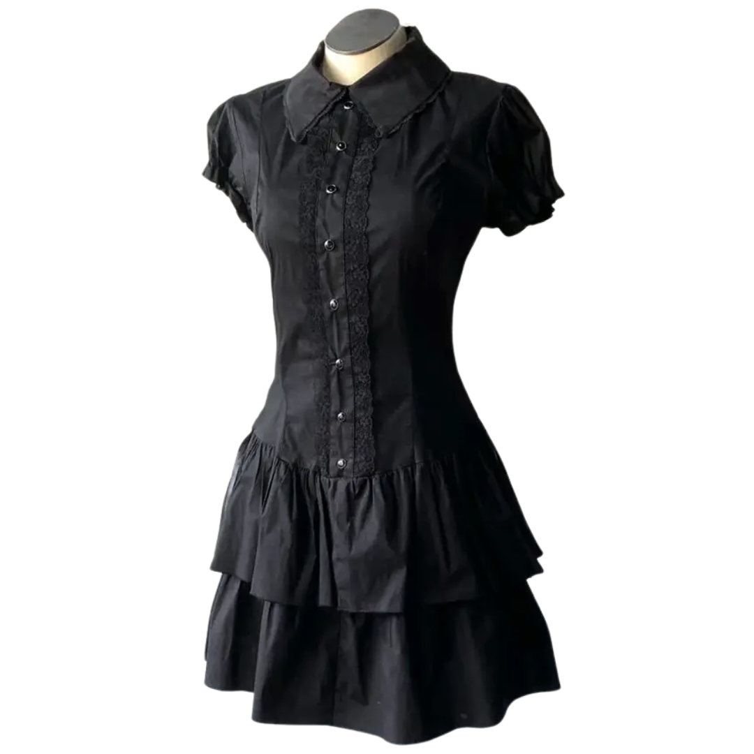 Tailored from smooth black poplin, this Y2K‑inspired dress pairs a lace‑loop button front with a double‑layered ruffle skirt for flirty movement. Soft puff sleeves and hidden side ties sculpt a slim, cinched waist without sacrificing comfort.