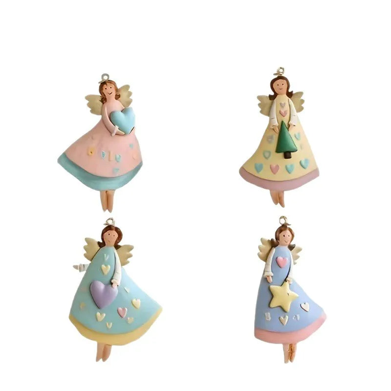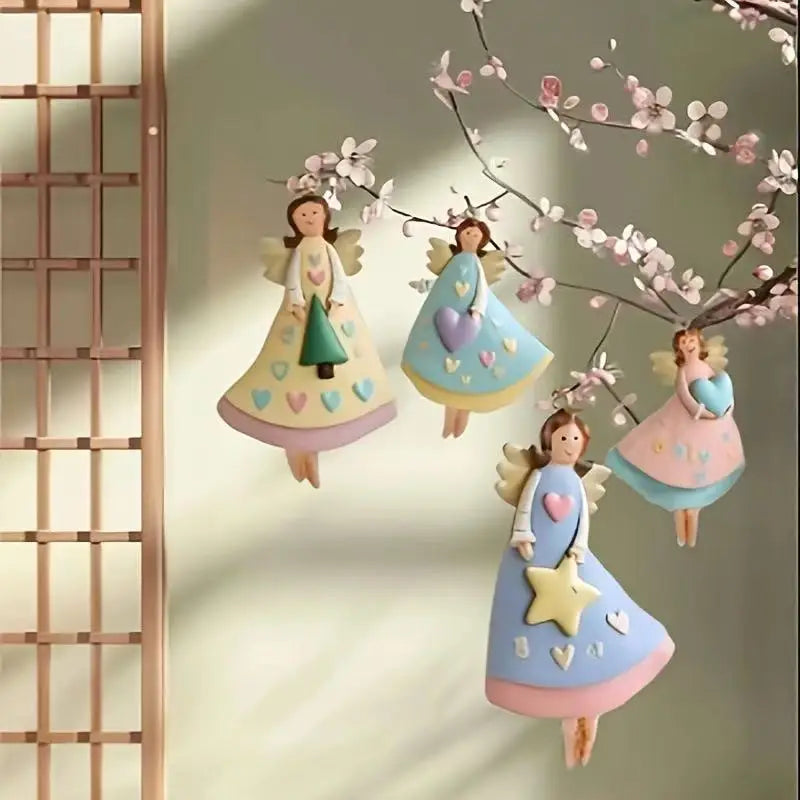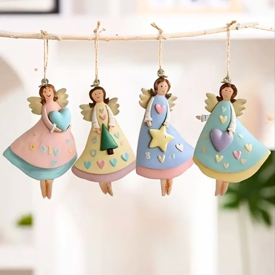 Soft pastel angels with heart and star details hang gently from natural twine, giving holiday décor a sweet, crafted charm. Each figure has a matte ceramic feel with hand-painted touches that bring out their warm, storybook personality.