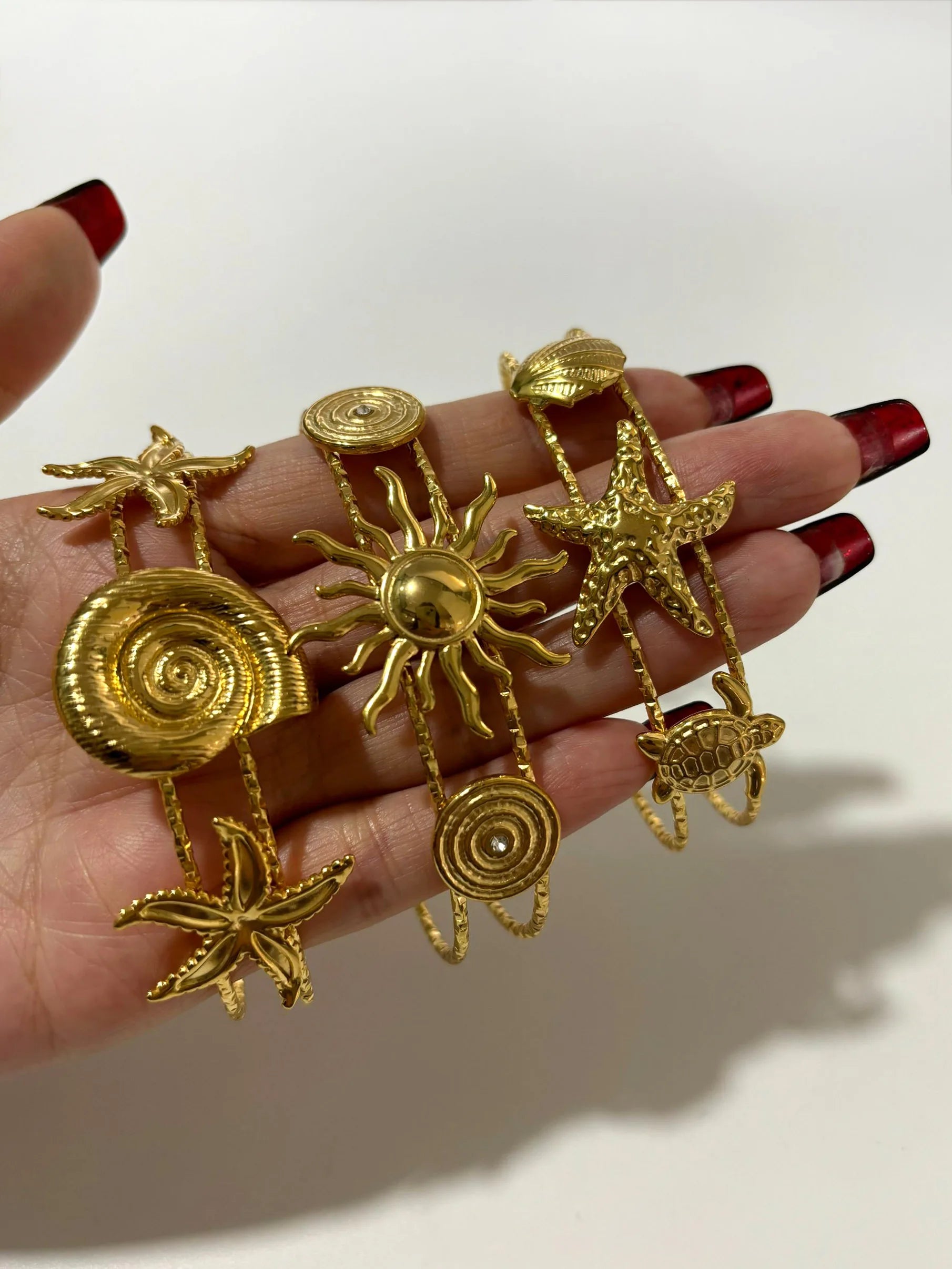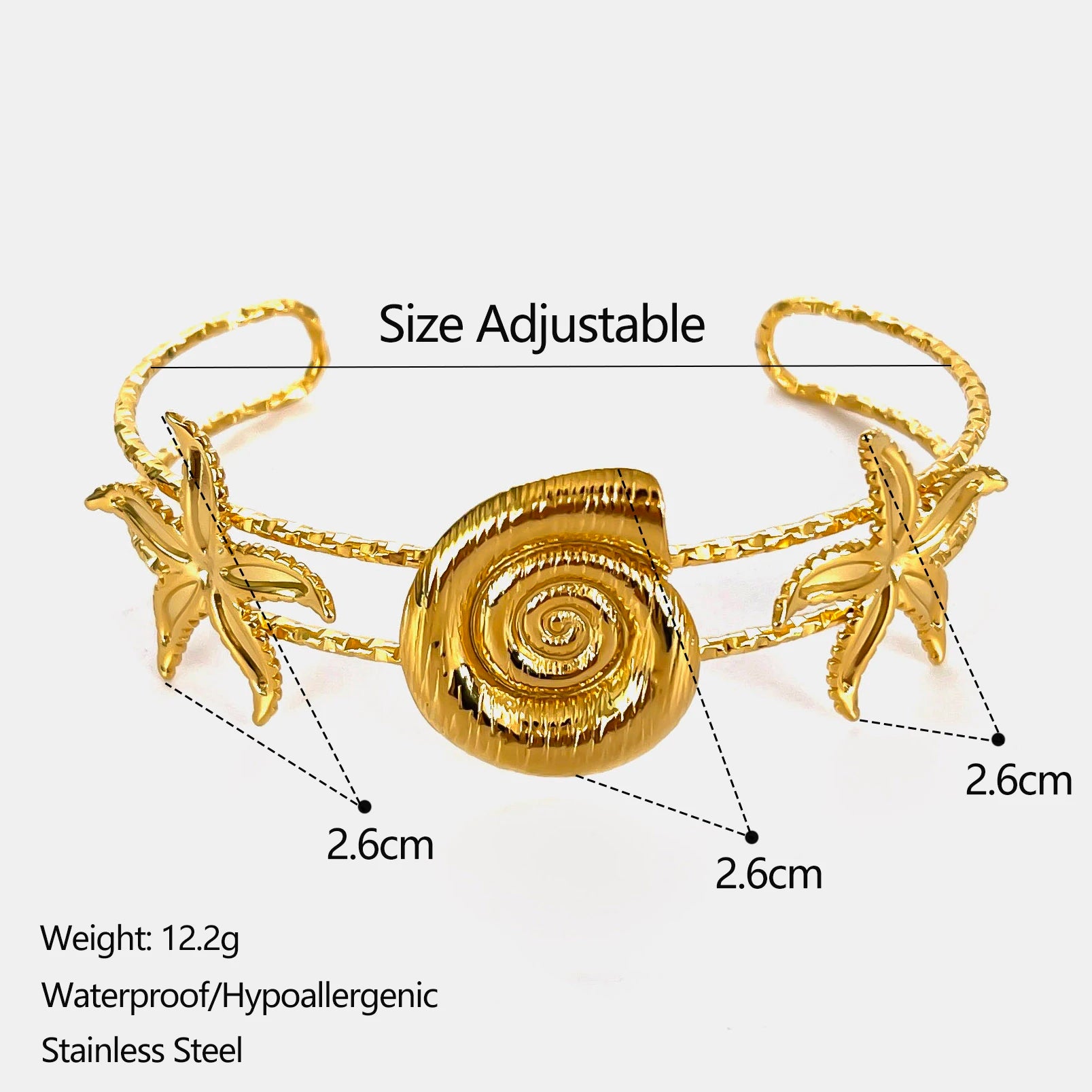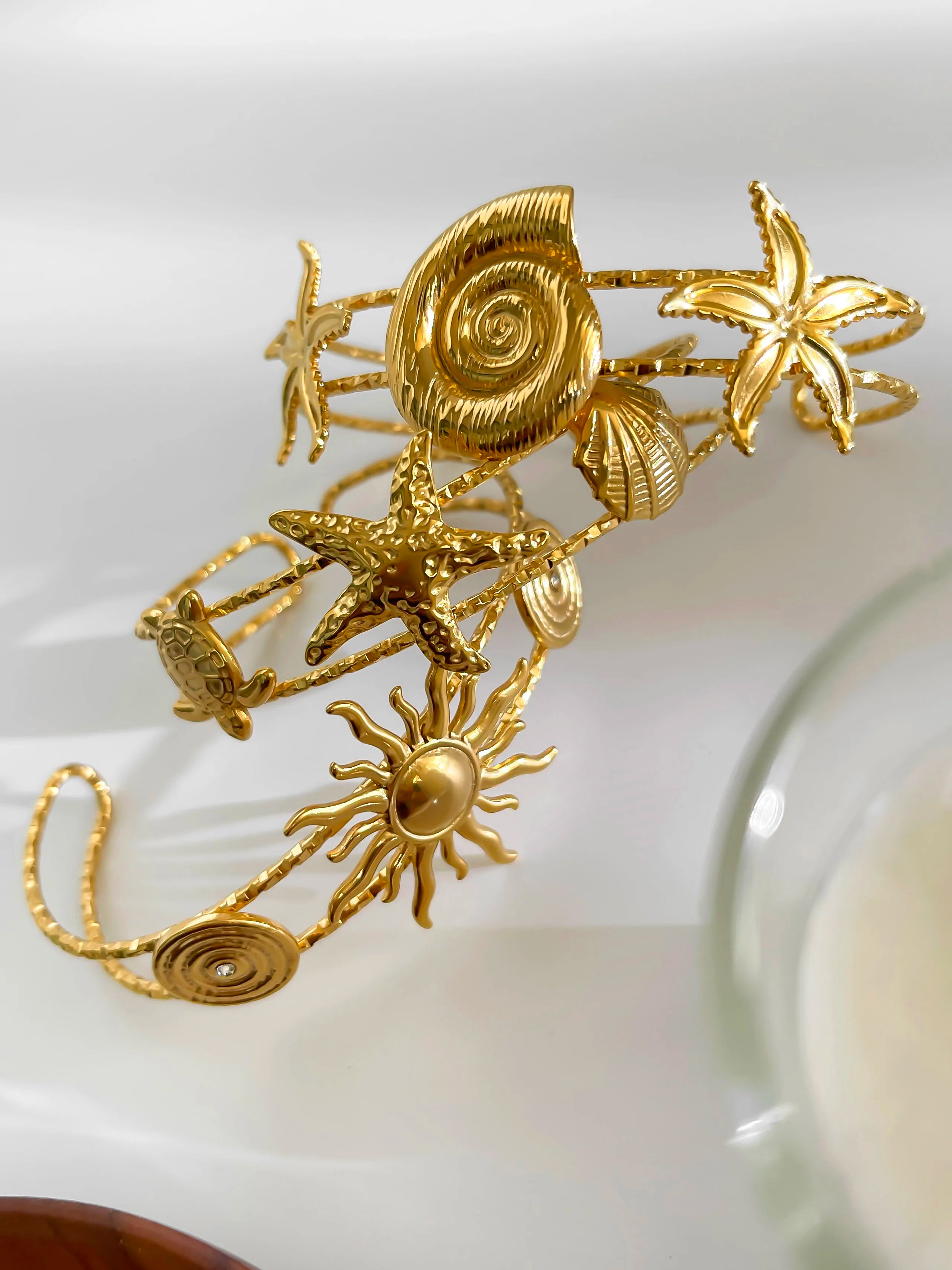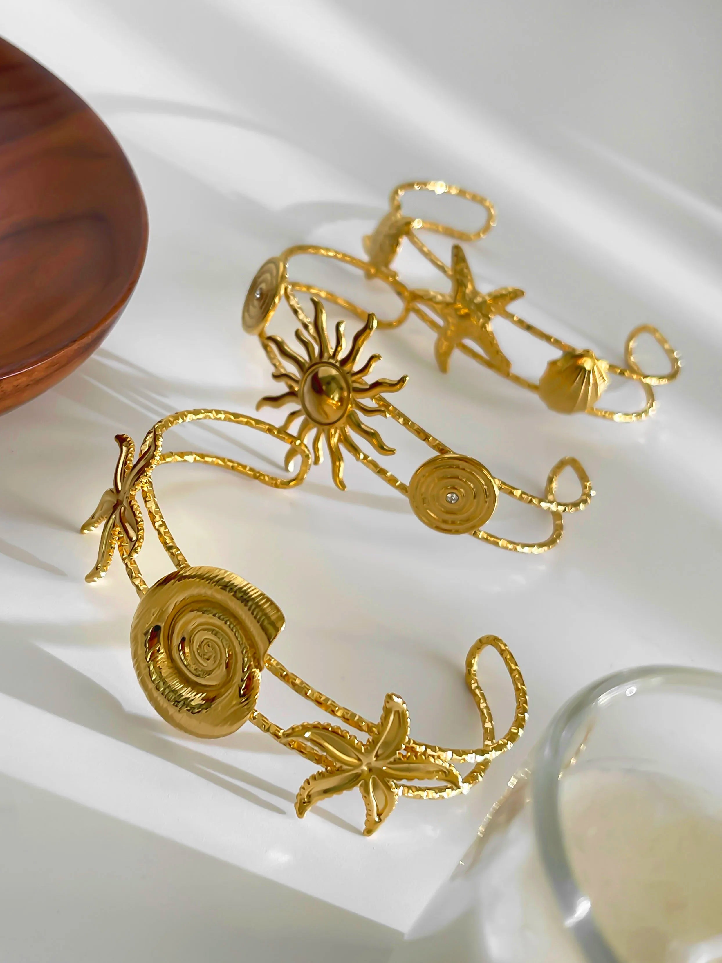 Revel in the spirit of the sea with this handcrafted gold-plated cuff. Conch and starfish charms add a bold maritime twist, while the double-layer opening stays true to a subtle punk edge. It’s a breezy yet glamorous piece that transitions seamlessly from casual beach days to candlelit evenings.