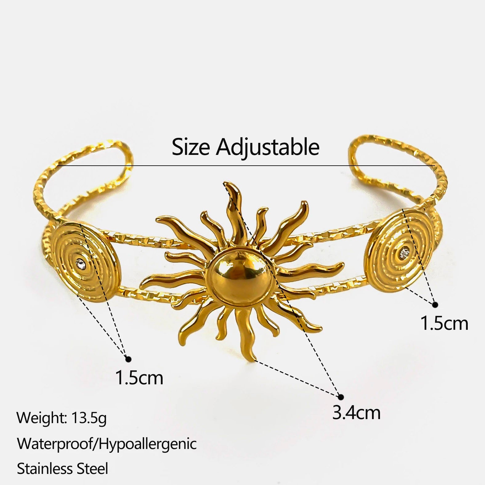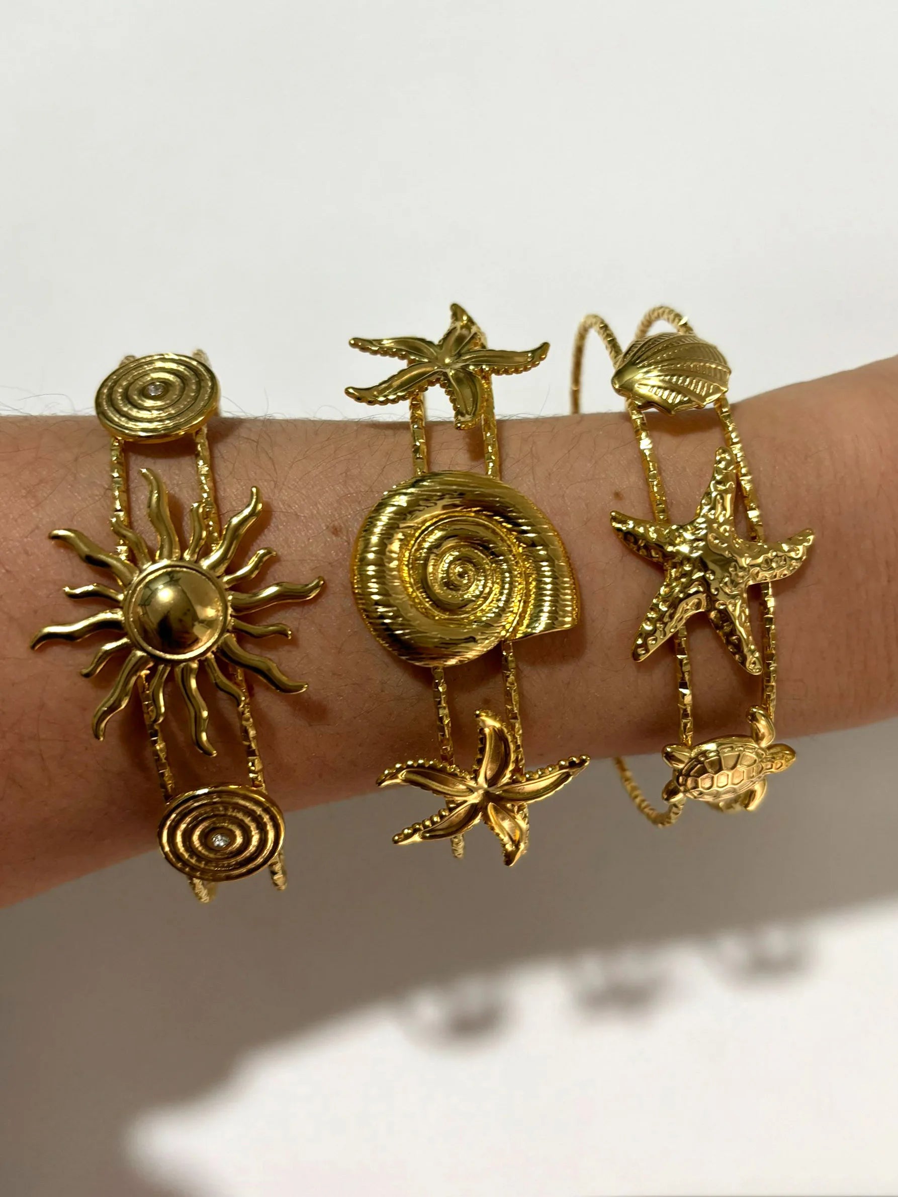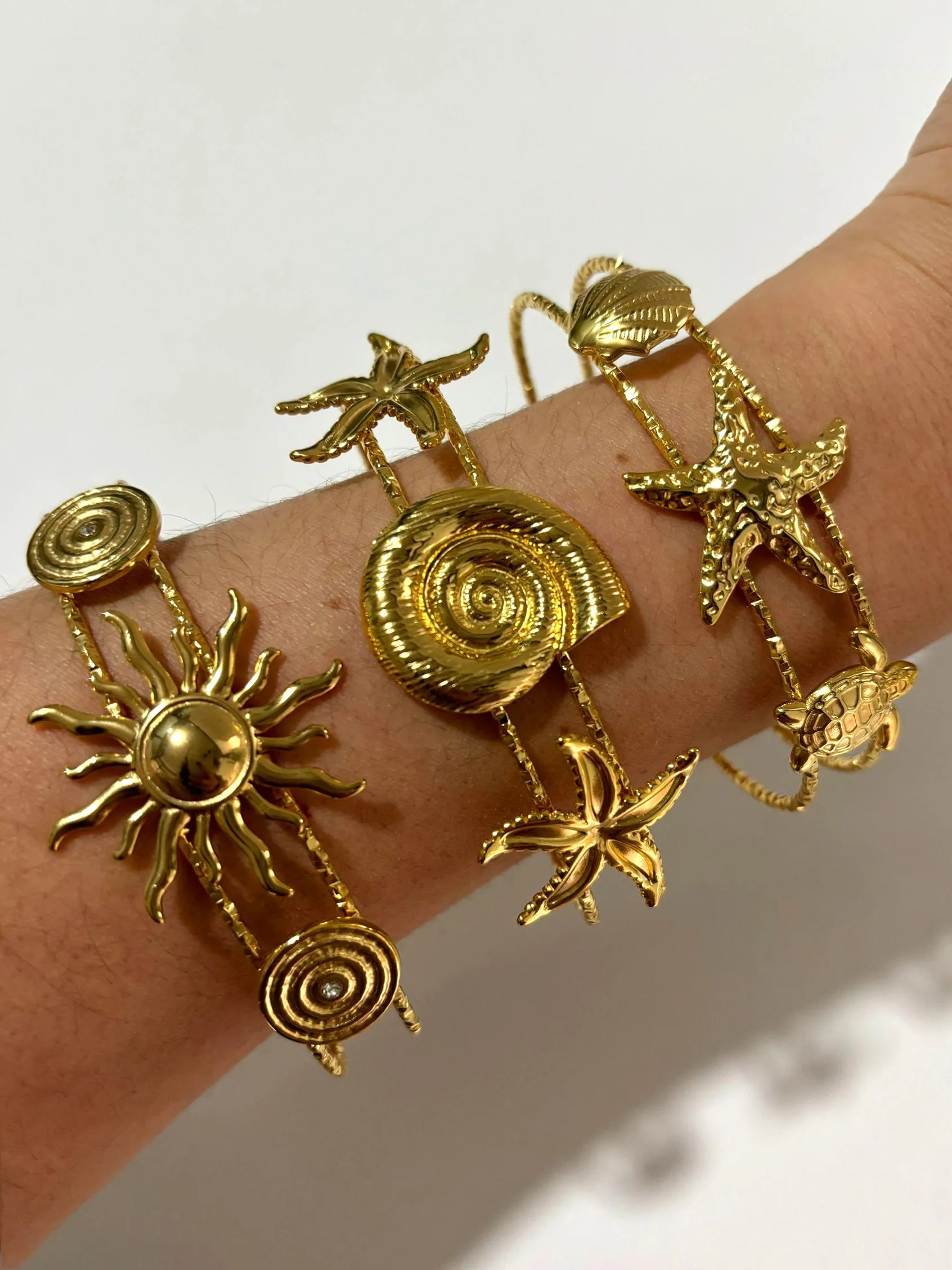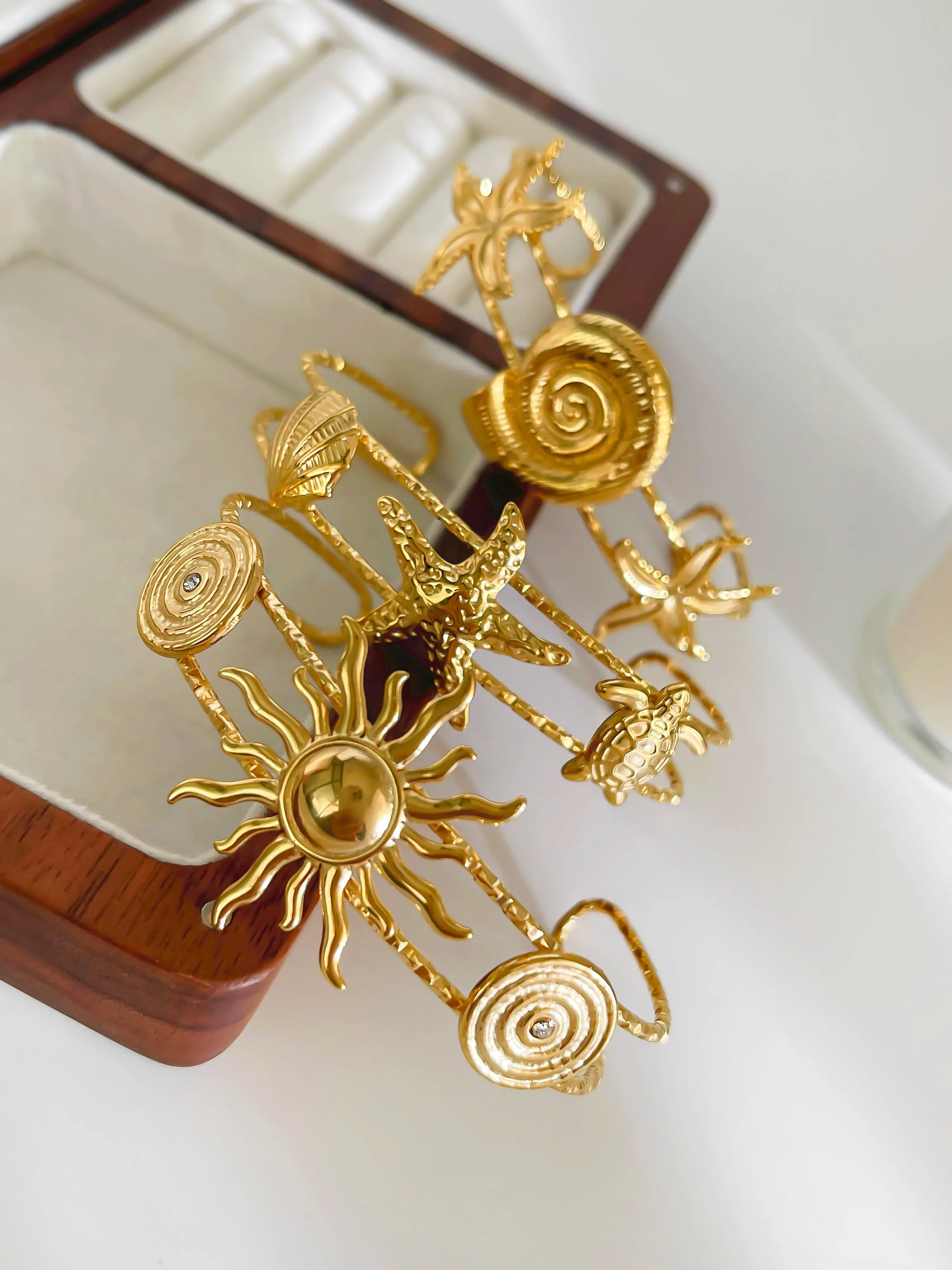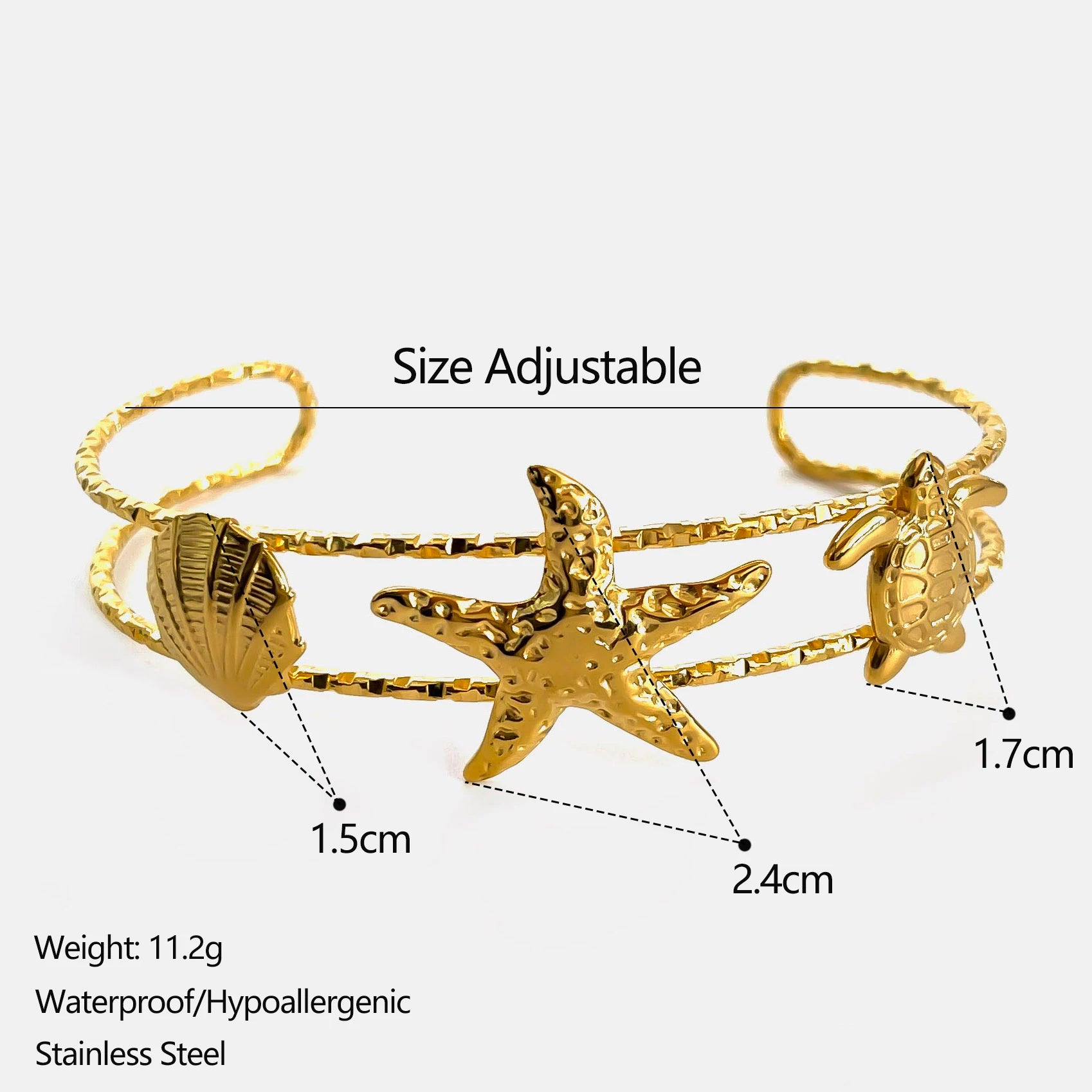 Revel in the spirit of the sea with this handcrafted gold-plated cuff. Conch and starfish charms add a bold maritime twist, while the double-layer opening stays true to a subtle punk edge. It’s a breezy yet glamorous piece that transitions seamlessly from casual beach days to candlelit evenings.