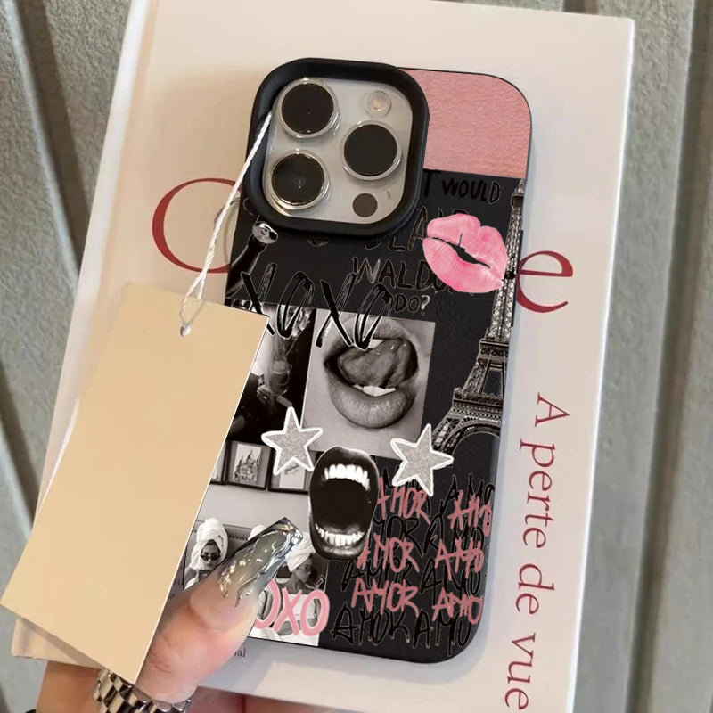 A black‑and‑white photomontage—Eiffel Tower, lipstick marks and hand‑drawn scrawl—prints across a soft‑touch shell that hugs the edges and stays pocket‑sleek. Raised bezels help protect the screen and lenses; artwork placement may vary by device.