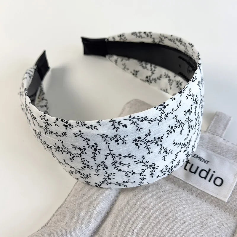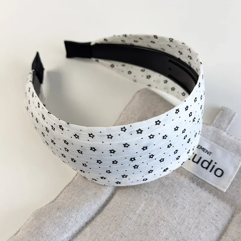 A padded, wide‑edge band in crisp black‑and‑white prints—polka dots and tiny florals that read timeless, not precious. Wrapped in smooth fabric with a soft, no‑pinch grip, it lifts any bun or blowout in one move.