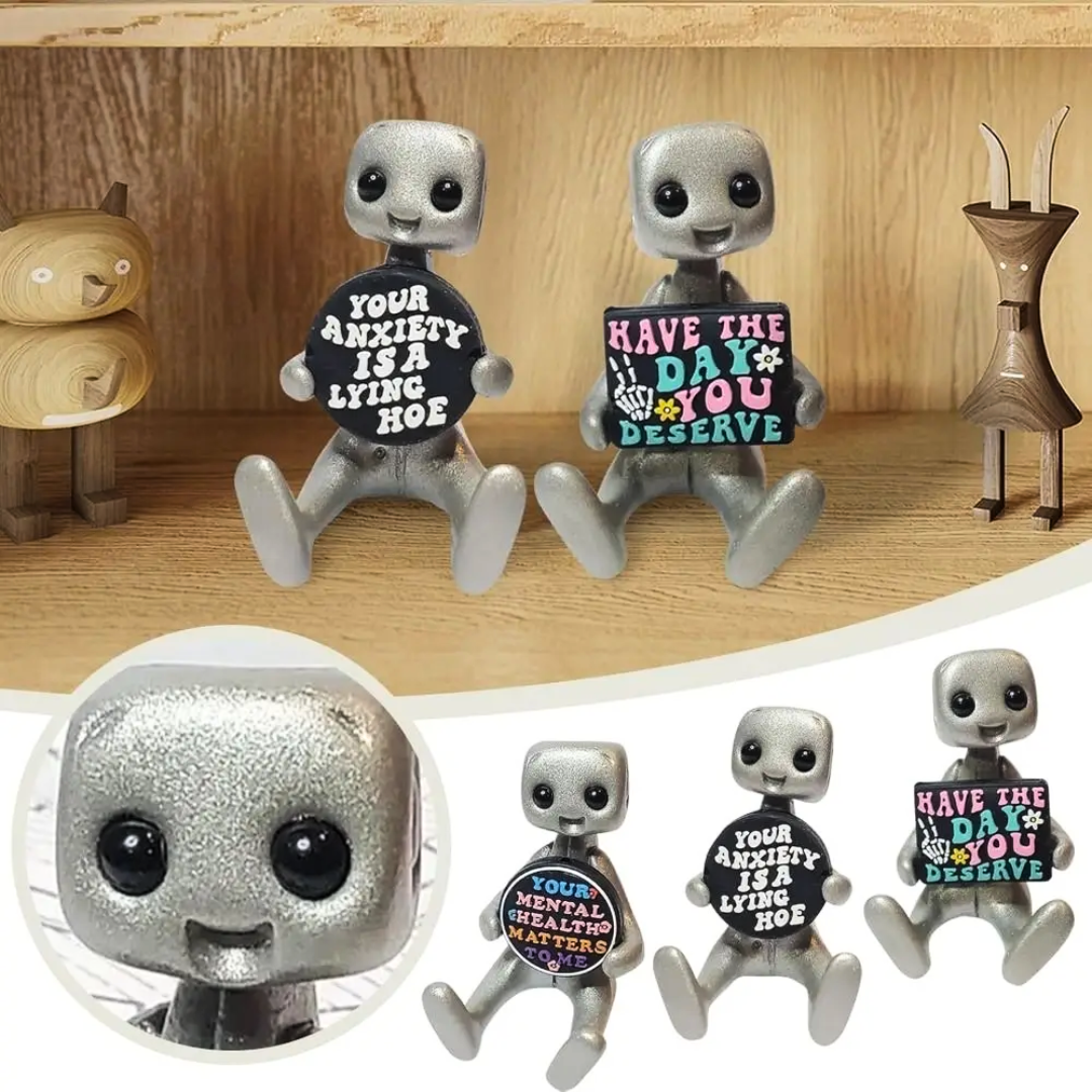 Inject a dose of positivity and personality into your workspace with these adorable resin robot figurines! Each little buddy holds a placard with a message designed to brighten your day, whether it's a gentle reminder to breathe or a sassy declaration that your anxiety is a lying hoe.