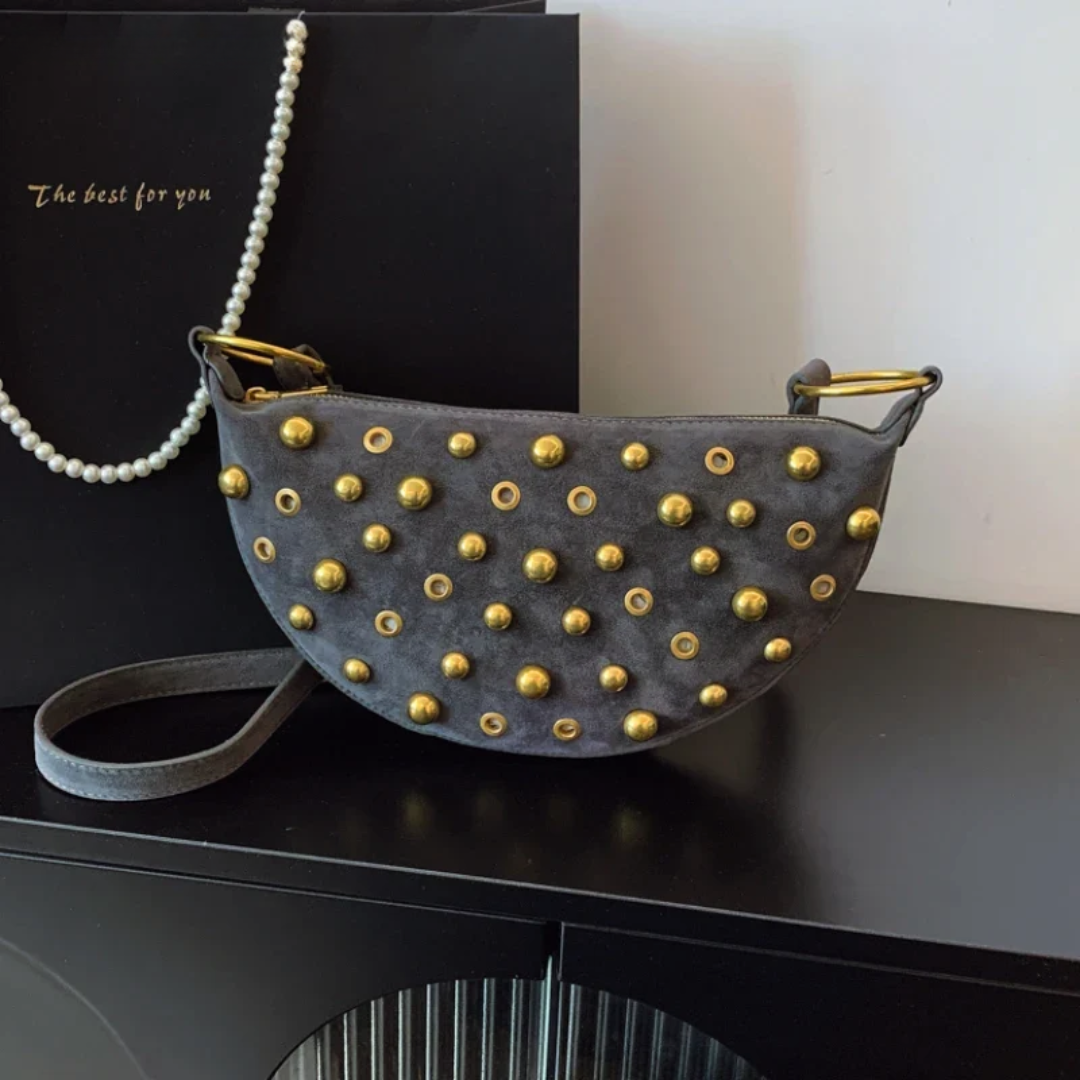 The Luna‑Stud is crafted in plush faux suede and paneled with polished gold rivets that catch the light from every angle. A top‑zip secures your essentials, while an adjustable strap lets you switch from crossbody to shoulder in seconds—perfect from coffee run to concert.