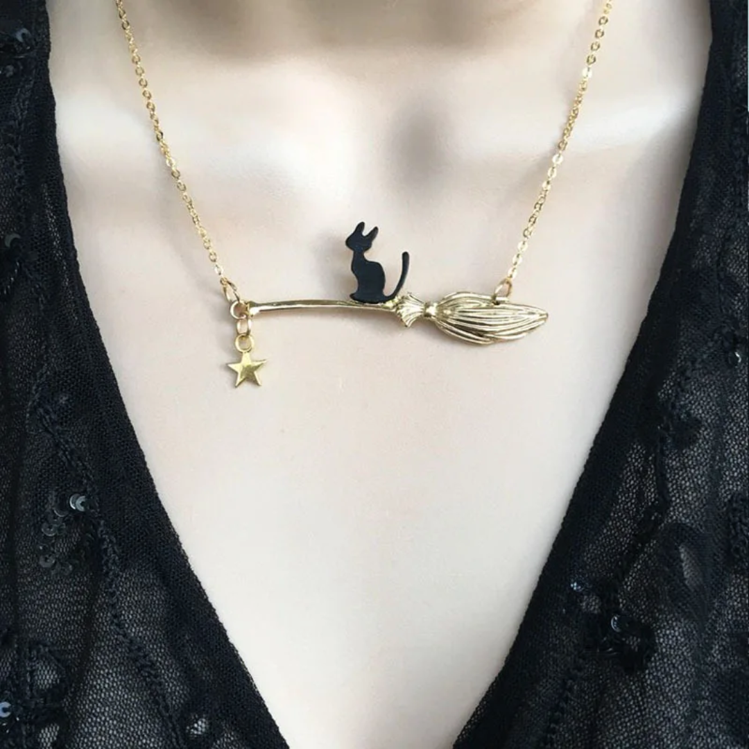 A tiny black cat sits perched on a golden broom, with a dangling star charm at one end and winged detail at the other, creating a little nighttime story across your collarbone. The fine chain lays flat against the skin, so the silhouette of the cat and broom stays front and center against dark dresses or light tops.