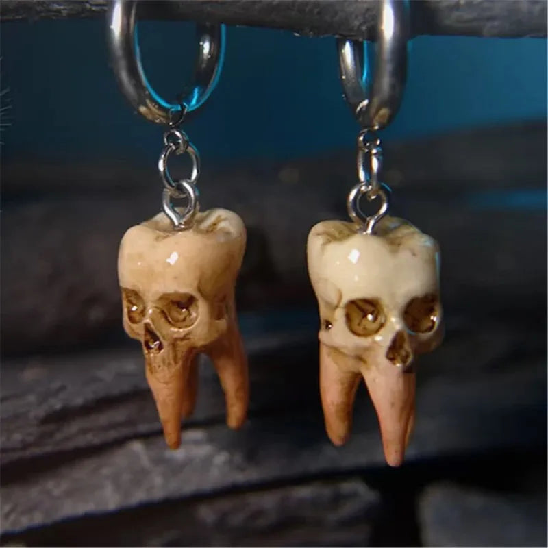 - Resin tooth charms with skull detail; antiqued finish