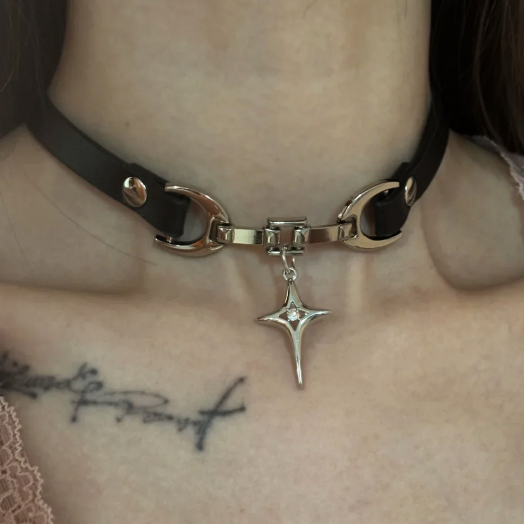 Supple strap hardware meets a twinkling star charm for a sleek, moto‑meets‑muse collar that frames the neck beautifully. Polished accents catch the light while the strap adjusts for a close, comfortable fit.