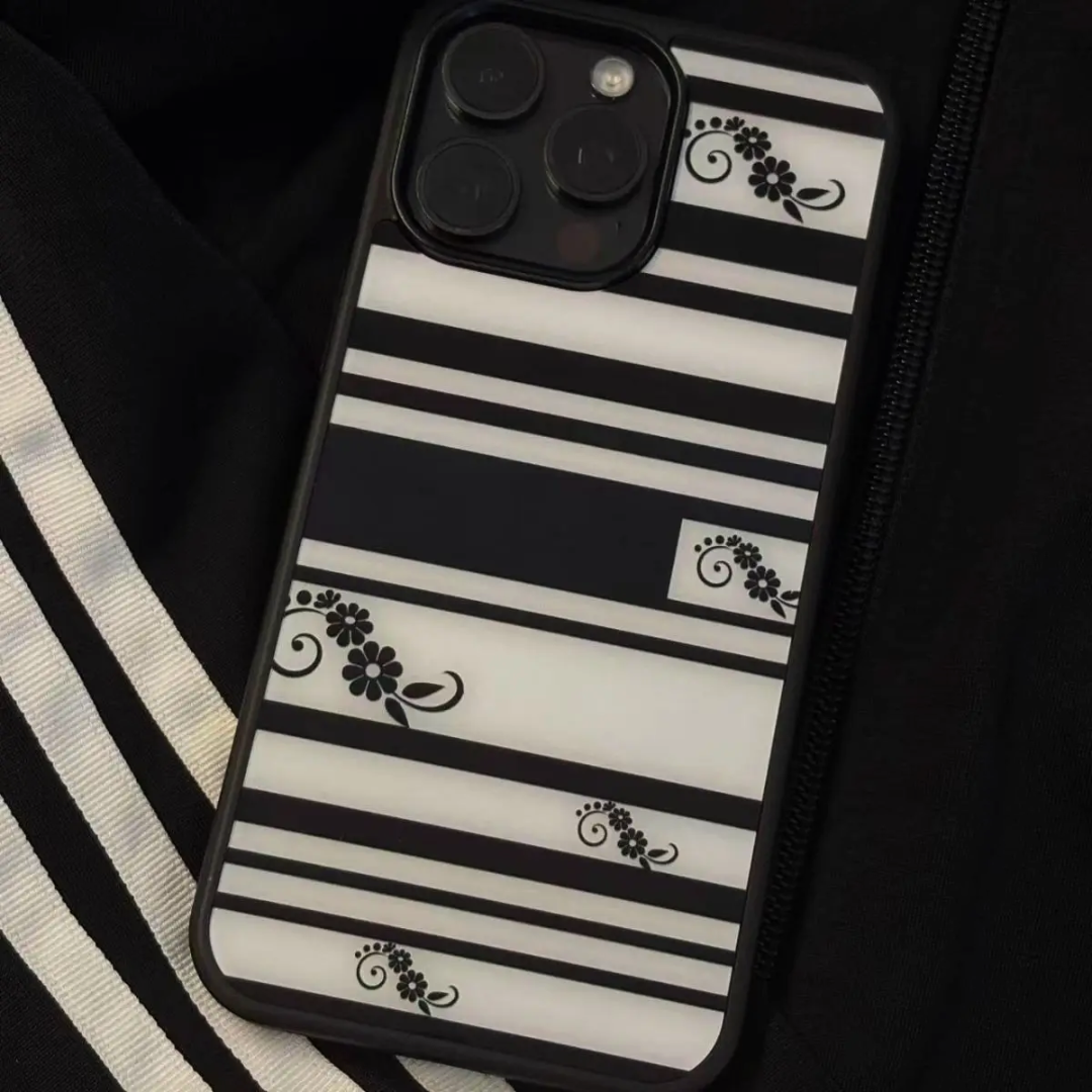 Jet‑black and porcelain stripes are sealed beneath a piano‑gloss coat, then finished with filigree floral scrolls that whisper Paris atelier. A feather‑slim shock frame hugs every curve, and the sculpted bezel floats your camera glass clear of tabletops while snapping clean to MagSafe. Classic monochrome, quietly elevated.